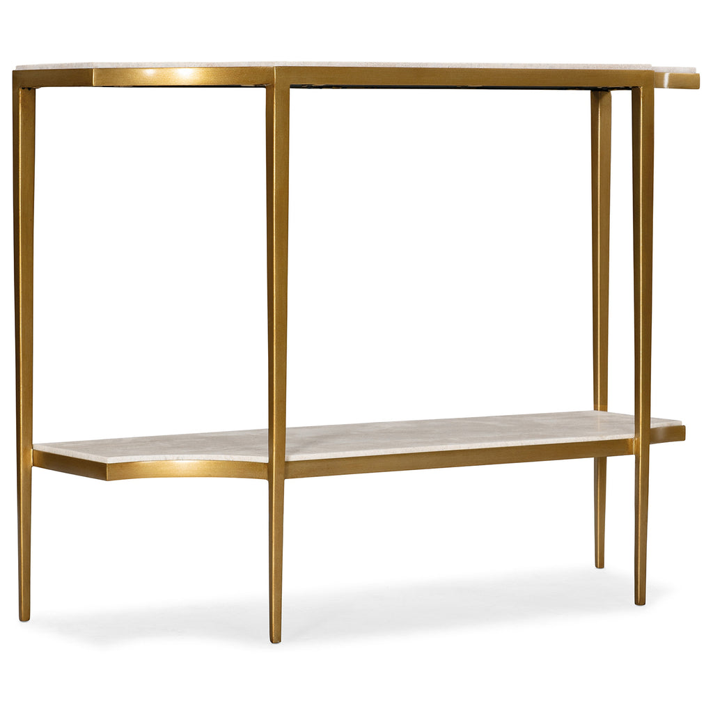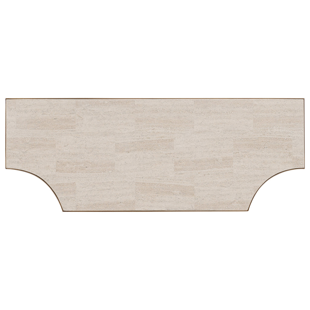 With understated opulence, the delicately-scaled Commerce & Market Console Table combines White Travertine Stone on the shaped top and bottom shelf with a gold-colored metal frame.