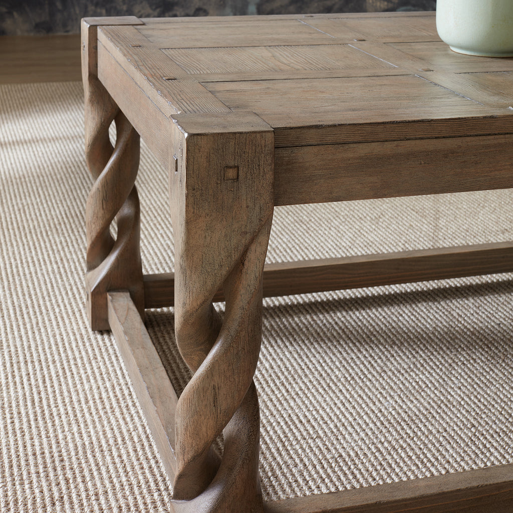 Exuding craftsmanship with attention to detail, the casual Jack O’Bein Cocktail Table has twisted legs and a paned veneer top with peg accents. Crafted of Pine Veneers, it has a medium wood finish.