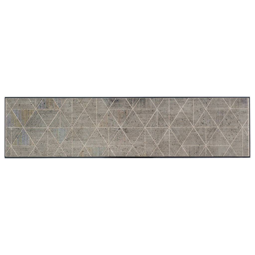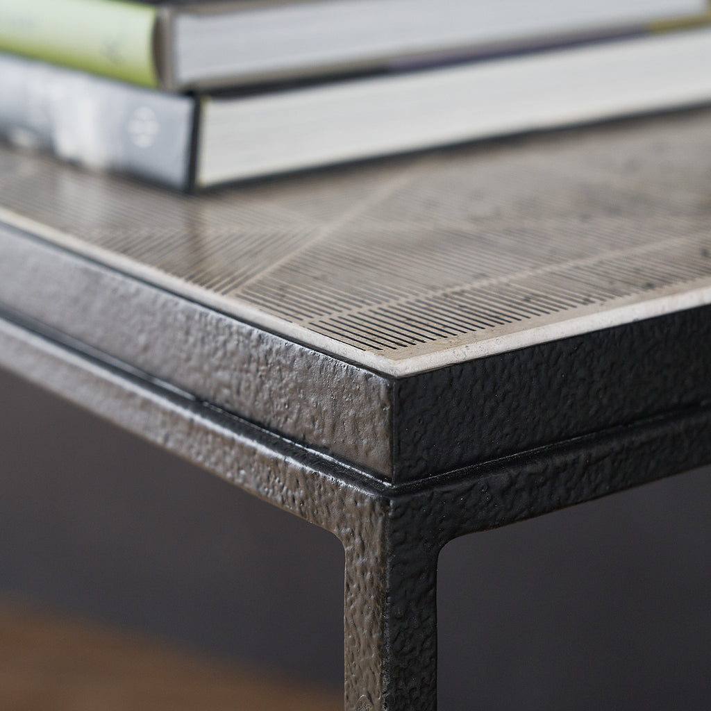 With a tribal design flair, the eclectic Metal-Wood Console combines natural materials, with a White Travertine Stone top with a screen-printed design and a forged black metal base.