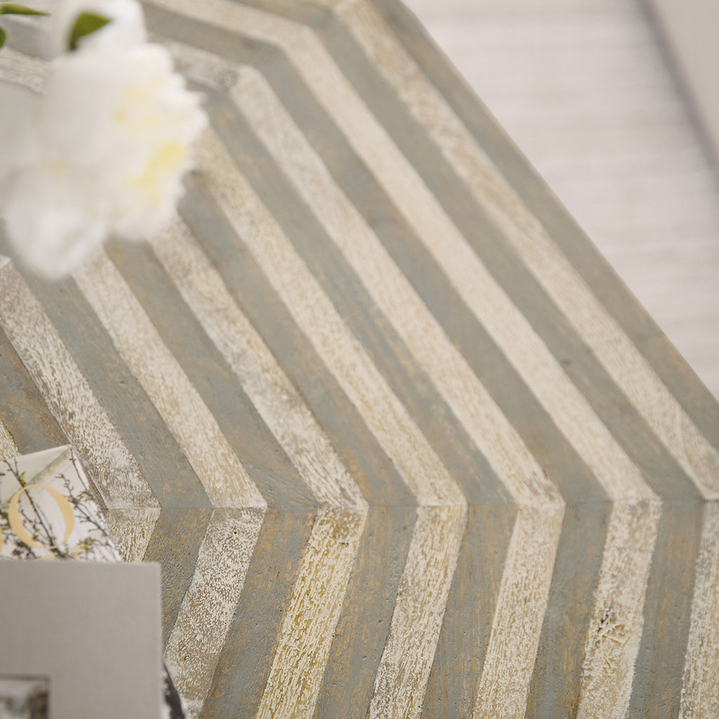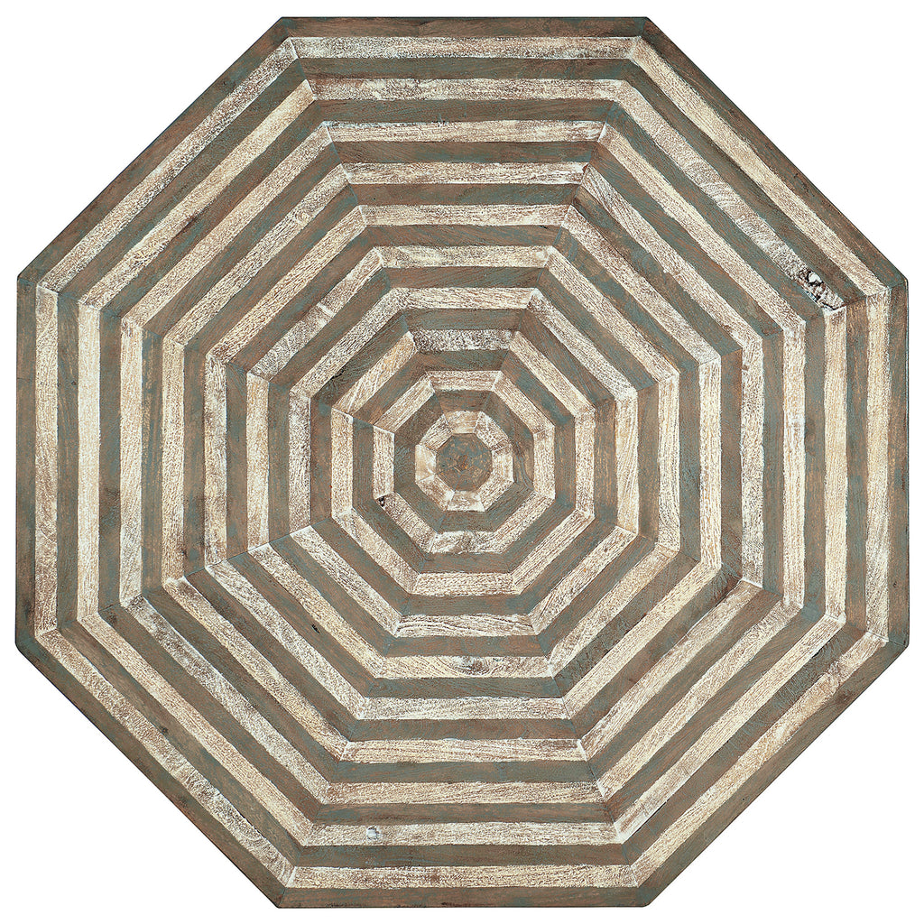 Offering a modern silhouette in a classic pattern, the Commerce & Market Cocktail Table has an octagonal shape, plinth base and a striped design using contrasting neutral-colored finishes. Crafted of Mango Wood, the table has a light wood finish and is on casters for easy mobility.