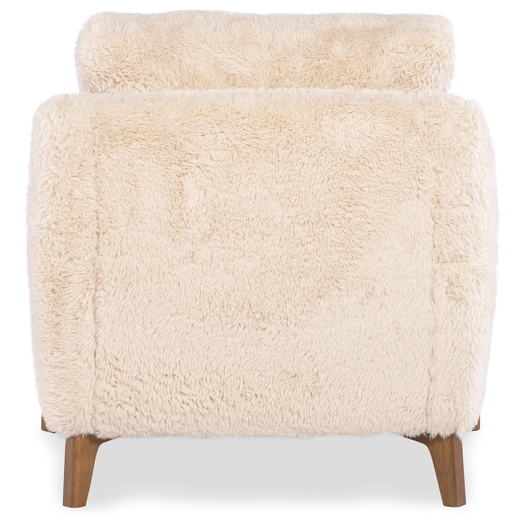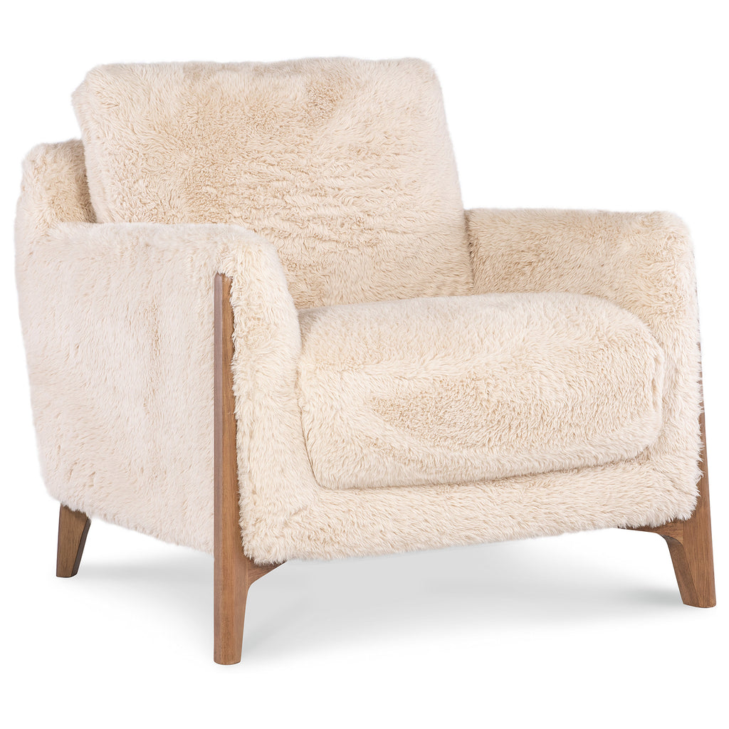 Get the laid-back feeling of staying in your bath robe all day with the Cynthia Chair, covered all over in a cozy furry fabric called Yakety Yak Sand. The wood legs and wood trim on the arm fronts have a light natural finish.