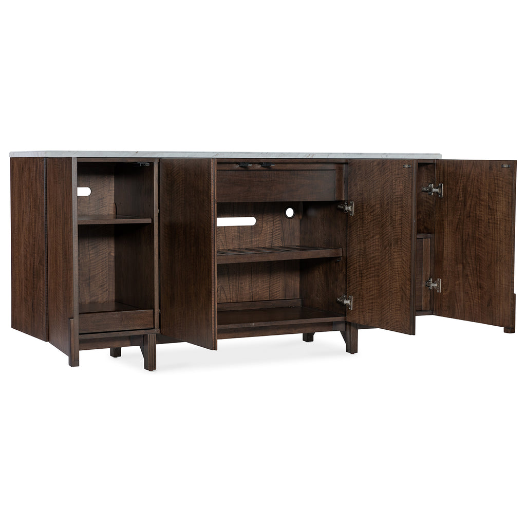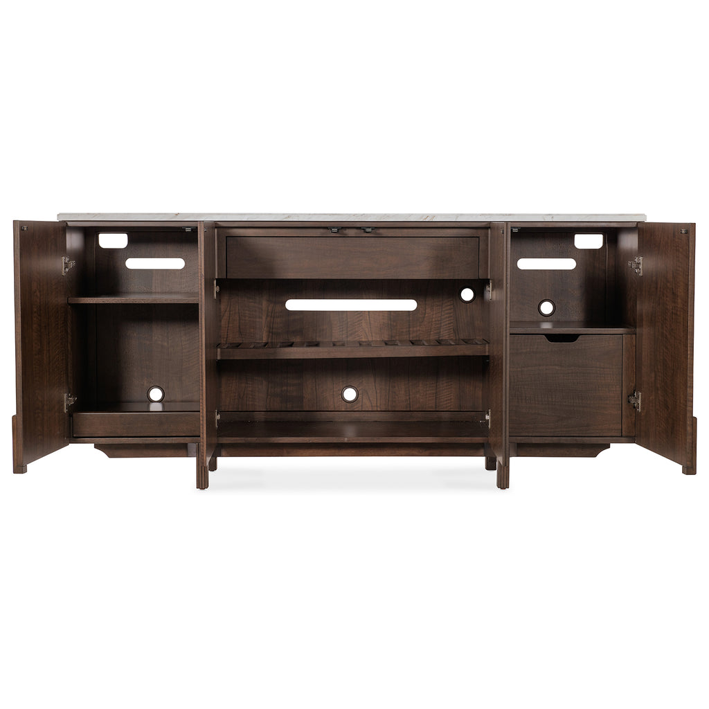 Rich, dark figured walnut veneers are accented by a Volakas Marble top in white, gray, cream and beige colors to create a striking and timeless piece with functional appeal. The four doors with soft close hinges have touch latches, and the left door has one adjustable wood shelf and one pull-out tray. The center pair of doors have one drawer and one adjustable/reversible wood shelf with wine option holding up to 10 bottles. The right doors with one file drawer accommodate letter or legal documents. Ventilated back panel and wire management. Gold-colored square knobs add an updated touch.