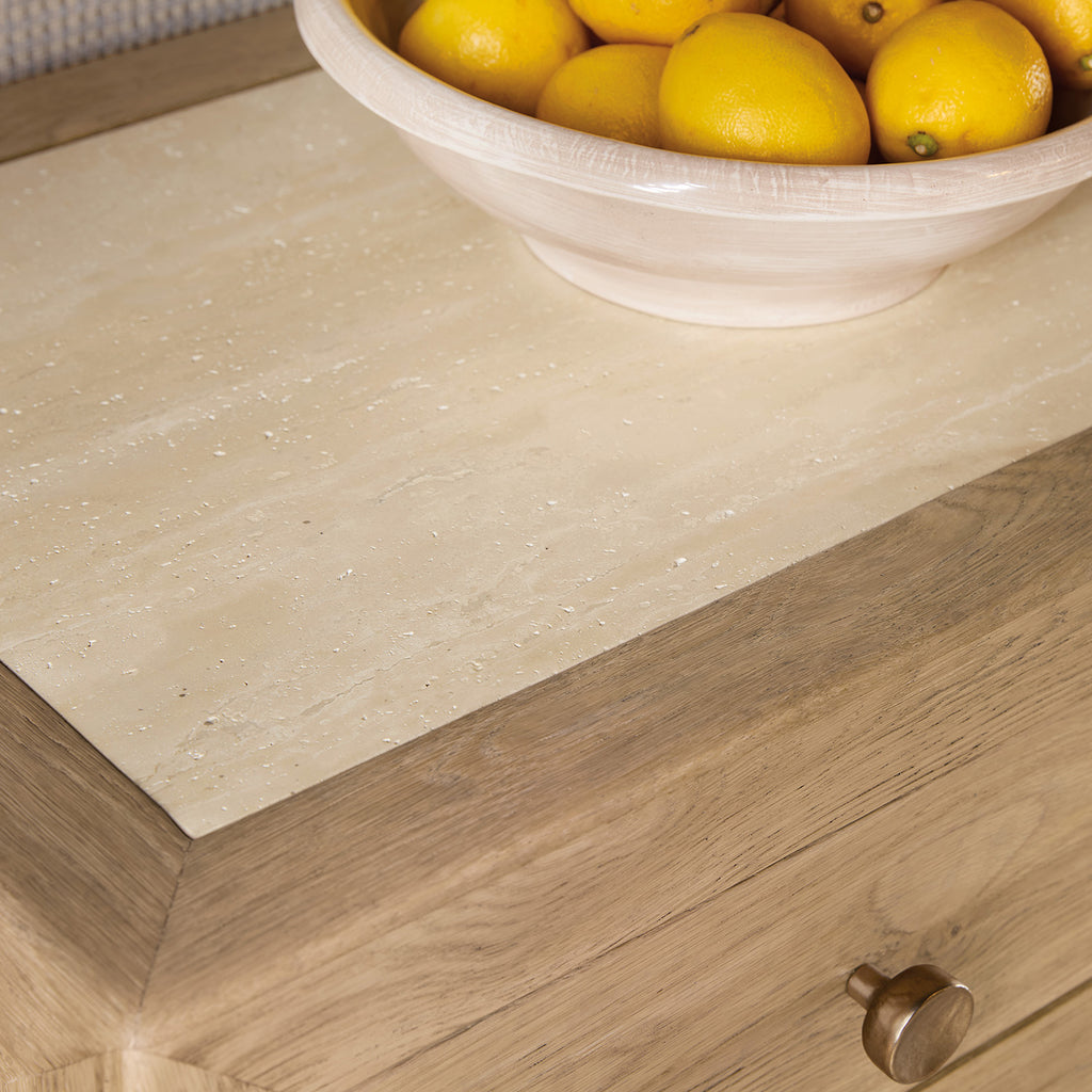With its inset stone top and the warm Buckboard finish reminiscent of sun-faded oak, this buffet delivers both durability and rustic charm. Featuring four self-closing drawers with a removable silverware tray, four wood doors with soft-close hinges, and adjustable shelving, it provides ample storage while making a design statement. The natural stone surface introduces texture and luxury, ideal for modern rustic dining spaces. Striking a balance between heritage craftsmanship and contemporary versatility, where history and refinement are woven into every detail, the 45-piece Driftwood collection is rooted in authenticity. Revealing a depth of texture and a timeworn patina that evokes the beauty of naturally agedmaterials, the collection unfolds in three finishes. Buckboard evokes the quietwarmth of sun-faded oak. Worn Saddle is deep and burnished, a nod to the supple leather of well-loved armchairs and hand-tooled heirlooms. And Burnt Timber, dark and moody, carries the quiet drama of wood softened by time and touch. With an emphasis on craftsmanship and enduring style, the Driftwood collection offers a sophisticated yet livable approach to design, reminding us that true beauty—like great design—only grows richer with time.