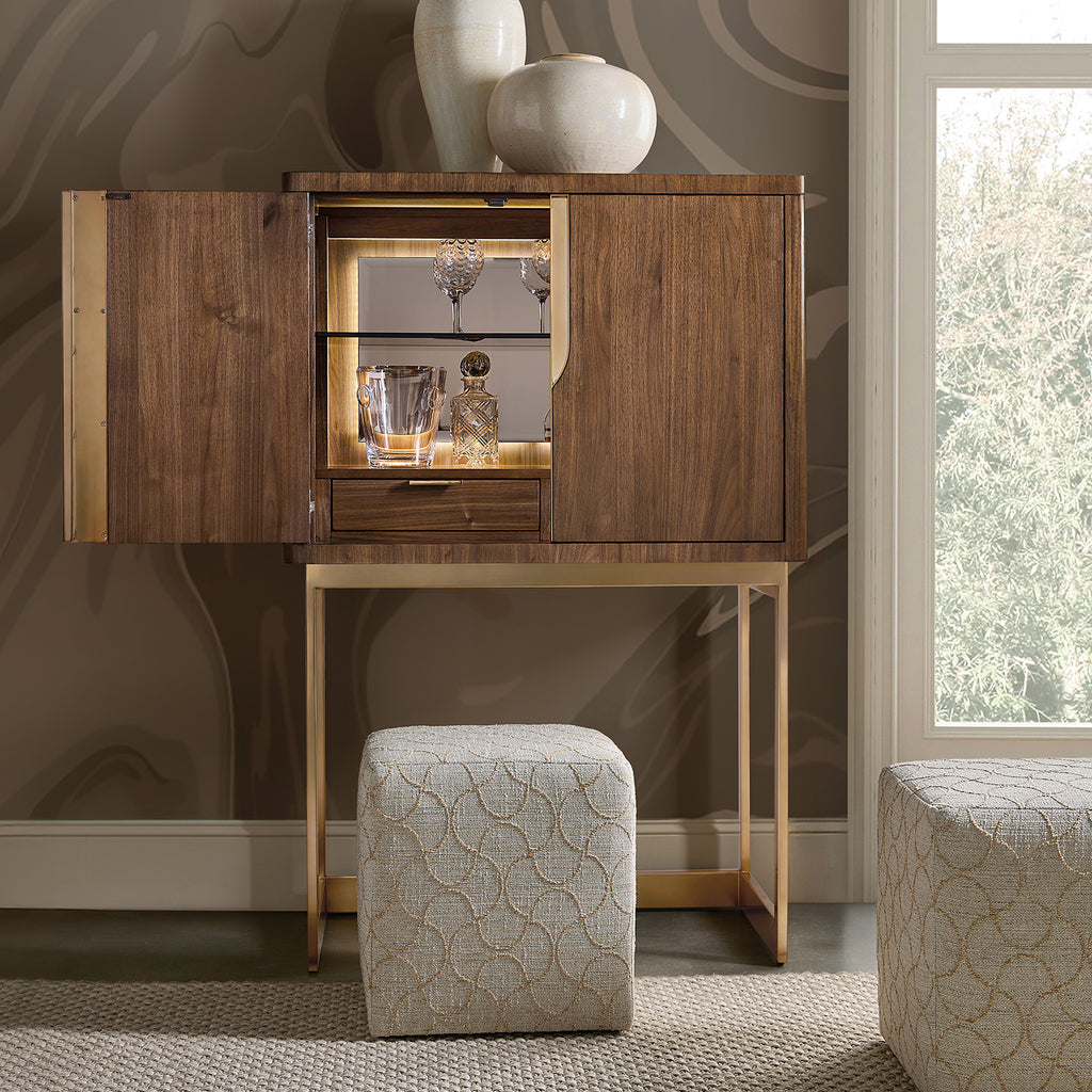 Entertain in style with the Eleana Bar on Stand, a show-stopping bar cabinet that blends Light Caramel walnut veneers with Sunlit Bronze metal accents. Behind its two wood doors with magnetic catches, you’ll find a floating backlit mirror with a three-intensity touch switch, an adjustable solar bronze glass shelf, and self-closing drawers for chic storage. Perfect for dining rooms or stylish living spaces, this transitional bar stand offers both function and luxury for the modern entertainer. Marrying sculptural refinement with an effortless sense of luxury, the Eleana collection is a masterclass in contemporary elegance. The series, imbued with an effortless sense of sophistication, where sculptural silhouettes meet richly textured materials to create pieces that feel at once timeless and of the moment. Versatile in both scale and sensibility, Eleana's thoughtful proportions and nuanced finishes bring a sense of depth and harmony, lending itself seamlessly to a range of interiors, from intimate city dwellings to expansive retreats. Infused with a relaxed yet polished sensibility, Eleana embodies the essence of modern living; stylish, inviting, and intuitively crafted for the way we live today.