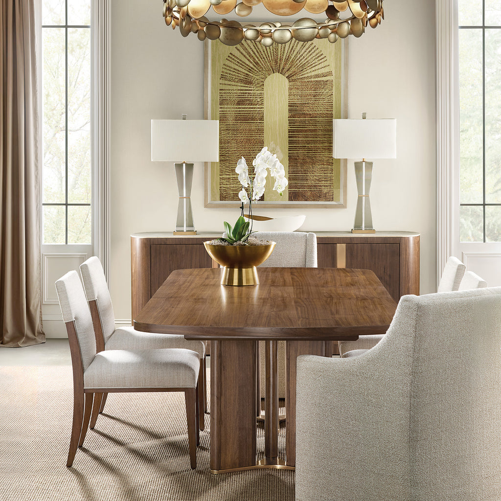 A stunning mix of form and function, the Eleana Credenza features Light Caramel walnut veneers, honed marble top in soft white and beige tones, and Sunlit Bronze hardware. Behind the four soft-close doors, you’ll find adjustable shelving, self-closing drawers, and a silverware tray for organized storage. Its rounded sides and plinth base complete the luxurious design, making it perfect for dining rooms or living spaces. Marrying sculptural refinement with an effortless sense of luxury, the Eleana collection is a masterclass in contemporary elegance. The series, imbued with an effortless sense of sophistication, where sculptural silhouettes meet richly textured materials to create pieces that feel at once timeless and of the moment. Versatile in both scale and sensibility, Eleana's thoughtful proportions and nuanced finishes bring a sense of depth and harmony, lending itself seamlessly to a range of interiors, from intimate city dwellings to expansive retreats. Infused with a relaxed yet polished sensibility, Eleana embodies the essence of modern living; stylish, inviting, and intuitively crafted for the way we live today.