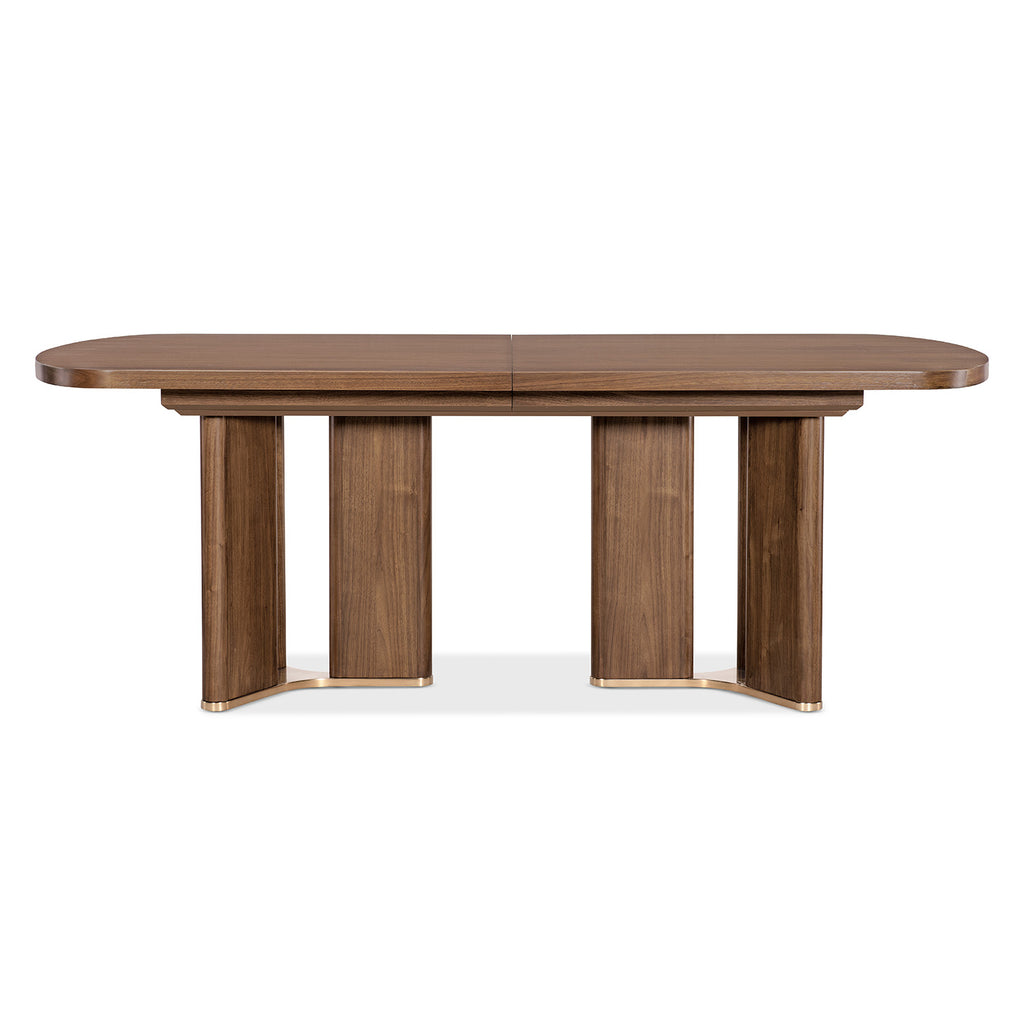 Transform your dining experience with the Eleana Rectangle Dining Table, a masterpiece of modern transitional style. Finished in Light Caramel walnut veneers and supported by a plated Sunlit Bronze double pedestal base, this table exudes sculptural elegance. With two 20-inch extension leaves, it expands to a generous 122 inches, making it perfect for intimate family meals or lavish gatherings. The warm wood tones and sleek metal accents create a sophisticated focal point for any dining room. Marrying sculptural refinement with an effortless sense of luxury, the Eleana collection is a masterclass in contemporary elegance. The series, imbued with an effortless sense of sophistication, where sculptural silhouettes meet richly textured materials to create pieces that feel at once timeless and of the moment. Versatile in both scale and sensibility, Eleana's thoughtful proportions and nuanced finishes bring a sense of depth and harmony, lending itself seamlessly to a range of interiors, from intimate city dwellings to expansive retreats. Infused with a relaxed yet polished sensibility, Eleana embodies the essence of modern living; stylish, inviting, and intuitively crafted for the way we live today.
