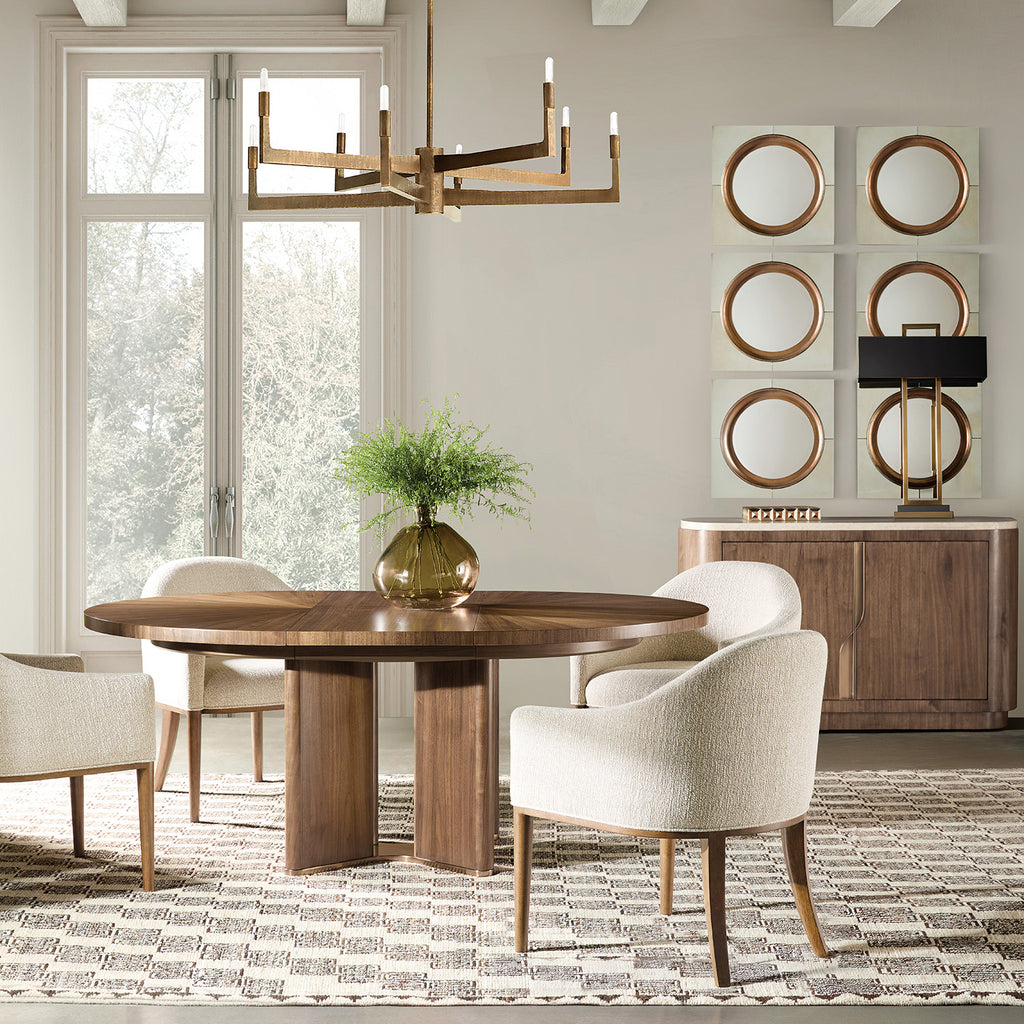 Elevate your dining setting with the Eleana Upholstered Arm Chair, crafted with a Light Caramel walnut veneer frame and beige fabric upholstery. The welt trim detailing and tapered wood legs exude sophistication, while the classic linen fabric blend (polyester, viscose, and linen) adds durability. Perfect for transitional dining rooms, this arm chair combines comfort and timeless elegance. Marrying sculptural refinement with an effortless sense of luxury, the Eleana collection is a masterclass in contemporary elegance. The series, imbued with an effortless sense of sophistication, where sculptural silhouettes meet richly textured materials to create pieces that feel at once timeless and of the moment. Versatile in both scale and sensibility, Eleana's thoughtful proportions and nuanced finishes bring a sense of depth and harmony, lending itself seamlessly to a range of interiors, from intimate city dwellings to expansive retreats. Infused with a relaxed yet polished sensibility, Eleana embodies the essence of modern living; stylish, inviting, and intuitively crafted for the way we live today.