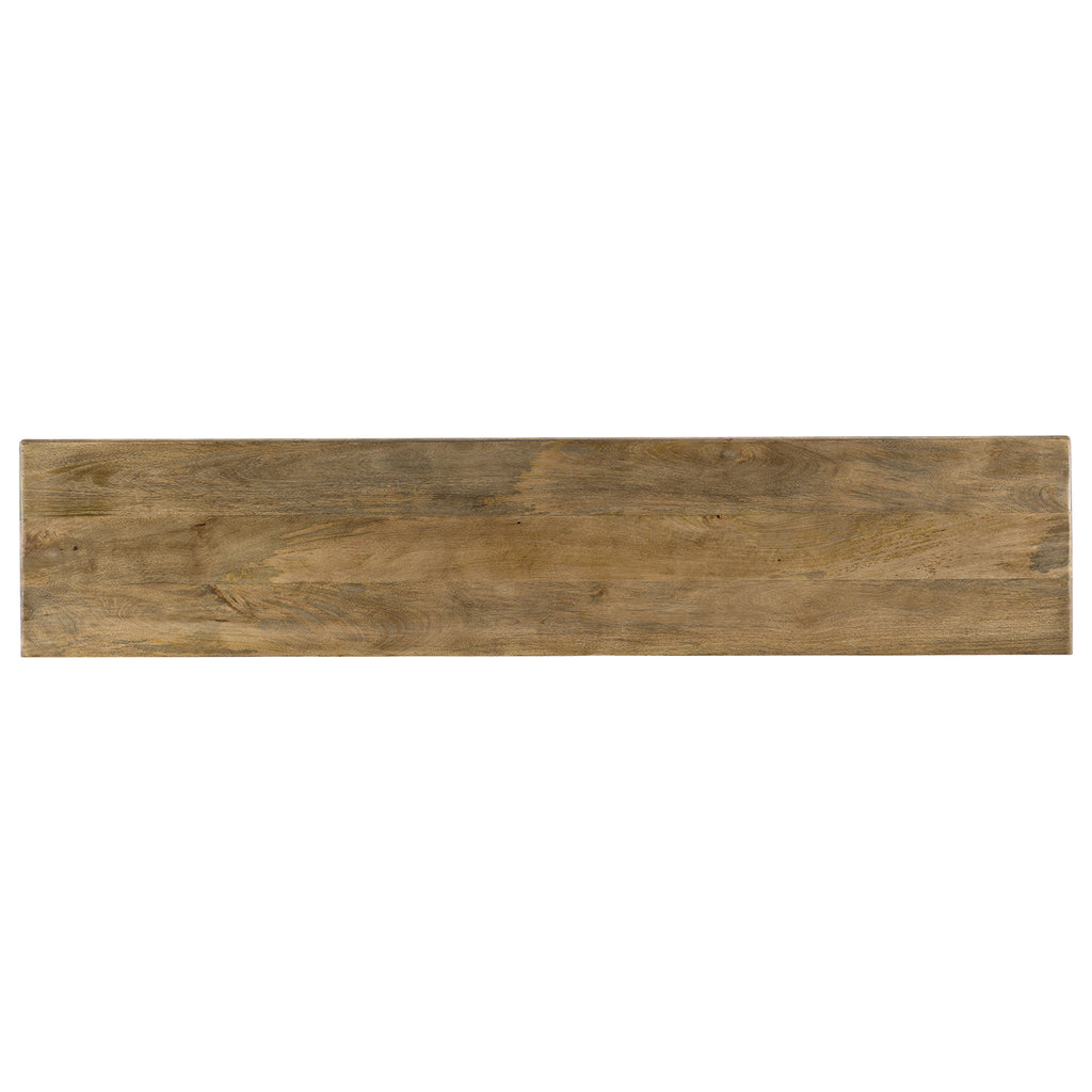 Mango Wood, German Silver and Iron come together for a tactile and stylish combination of mixed media in the Four-Door Entertainment Console. The medium wood finish has a metal chevron inlay, complemented by a metal base and thumb pulls. There’s one adjustable shelf behind each pair of doors. Accommodates up to an 80-inch TV.