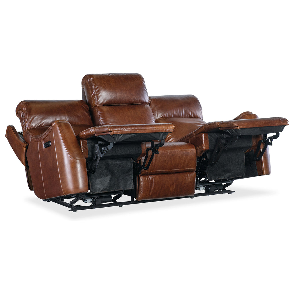 Casual goes chic with the Harlan Zero Gravity Power Recline Sofa with Power Headrest, featuring a bustle style back, sloped/scooped arm design and topstitch trim. Measuring 76 ½ inches wide, this sofa is covered in the aniline top-grain Carrington Walnut aniline top-grain leather. A USB port adds convenience.