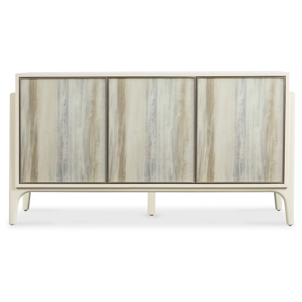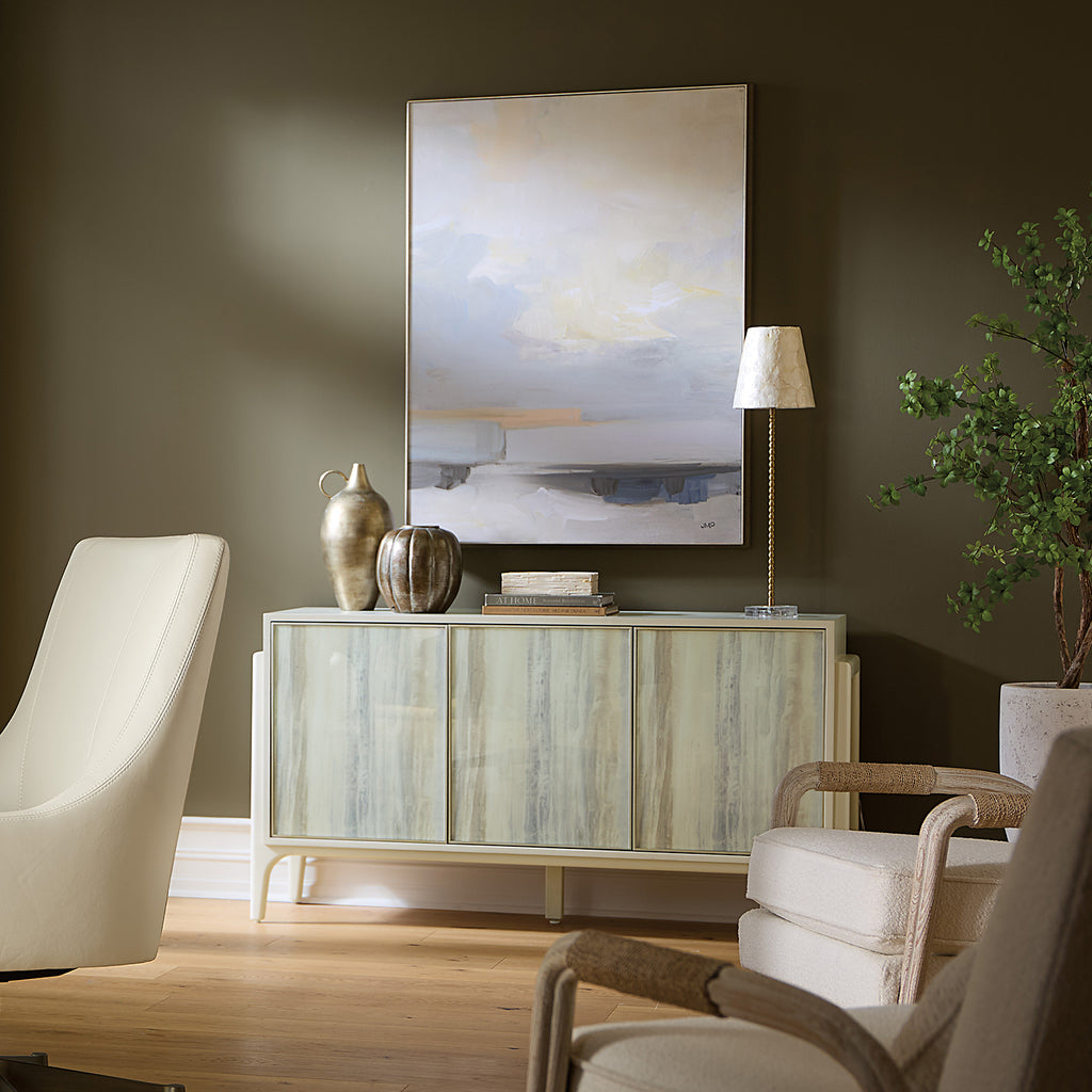 Crafted of Maple Veneers in a serene Almond White finish with reverse painted-glass door fronts in brown, gray and purple tones, the Hera Credenza is a stylistically versatile piece with functional appeal. The three doors have soft-close hinges and touch latches. The left and center door both have one adjustable/reversible wood shelf with wine bottle storage option. Each shelf will hold up to 4 bottles. Wire management and ventilation is offered both the left and center doors. The right door has two drawers, and the bottom drawer is a file drawer.