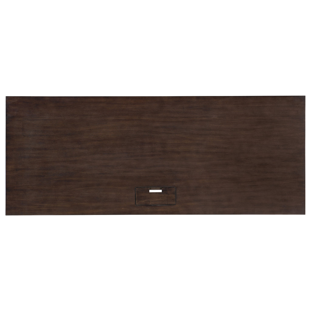 Add stylish work-from-home bandwidth to any space with the House Blend 60in Writing Desk with a sleek combination of the Dark Roast finish over Quartered Ash Veneers and silver metal trim. The bold silhouette is finished on all sides and features a power supply in the top for seamless electronics hook ups.