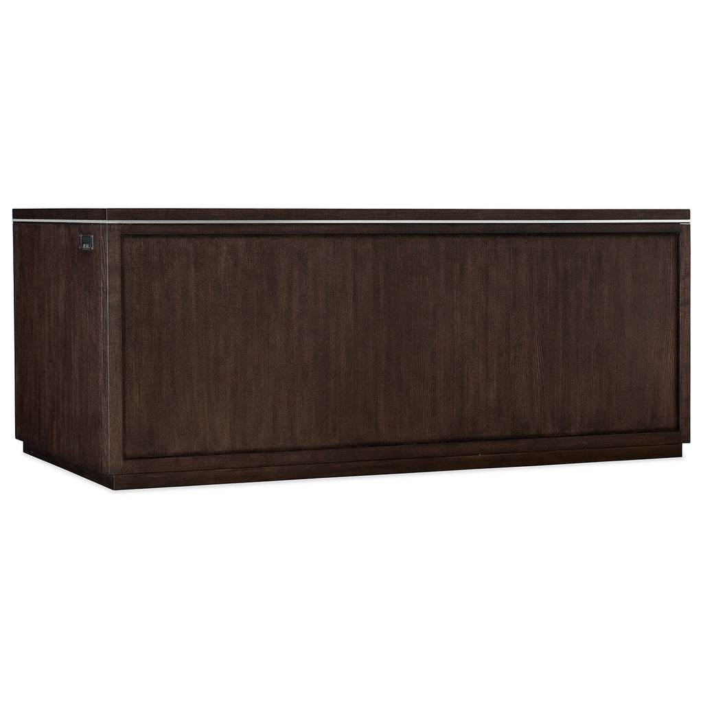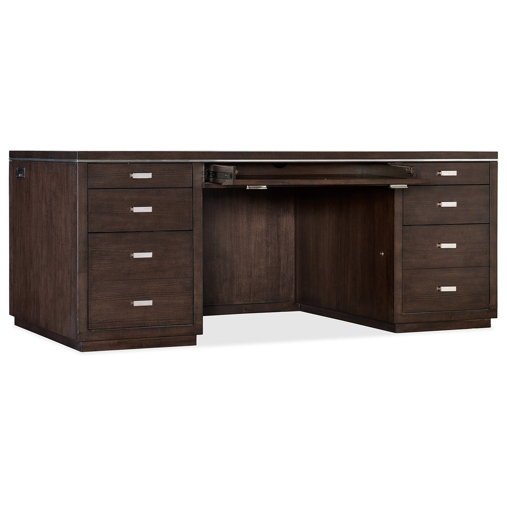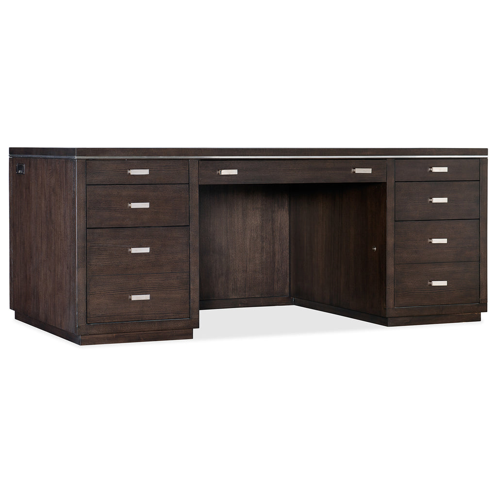 Add stylish work-from-home bandwidth to any space with the House Blend Executive Desk with a sleek combination of the Dark Roast finish over Quartered Ash Veneers, silver metal trim and polished stainless bar pulls. The bold silhouette has 7 drawers, with the top left and right drawers on full extension metal ball-bearing slides with removable divider inserts, one removable writing slide and one removable pencil drop-in that can be used on either side. Bottom drawers are locking file drawers with Pendaflex filing system and full extension metal ball-bearing slides. The center drawer has a drop-front for keyboard use. Finished on all sides.