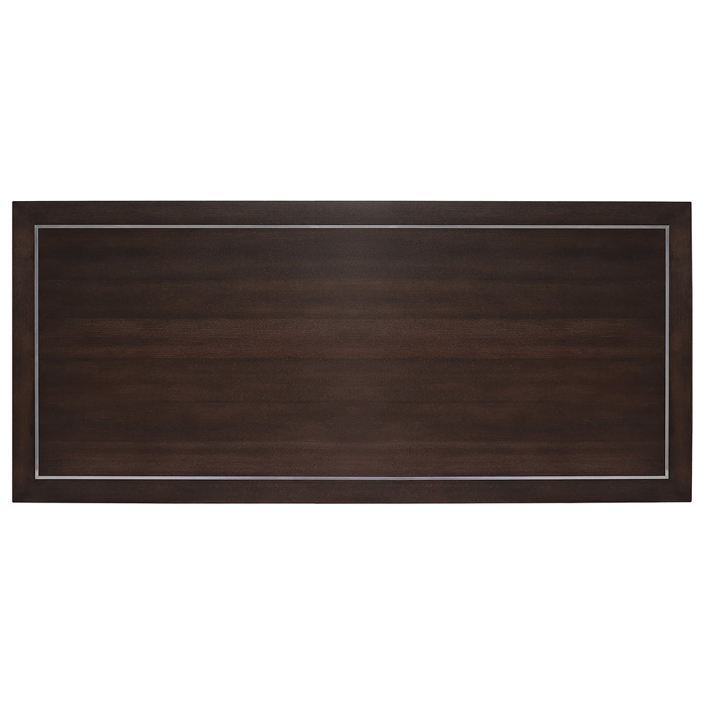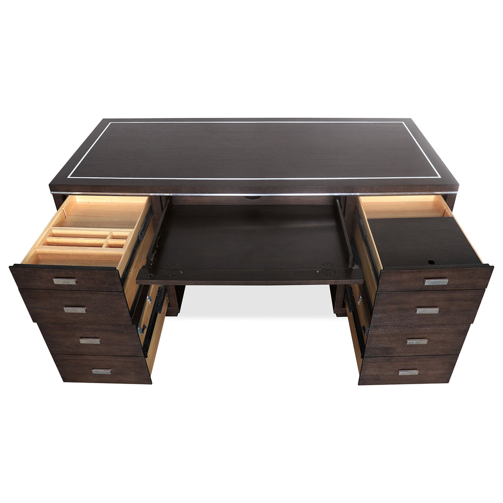In a Dark Roast finish over Quartered Ash Veneers with silver metal trim and polished stainless bar pulls, the sleek and stylish House Blend Desk will inspire your best work. Loaded with function, the desk has 7 drawers, with the top left and right drawers on full extension metal ball bearing slides with removable divider inserts. There’s one removable writing slide and one removable pencil drop-in that can be use on either side. The bottom drawers are locking file drawers with a pendaflex filing system. Finished on all sides so the desk can float in the room.