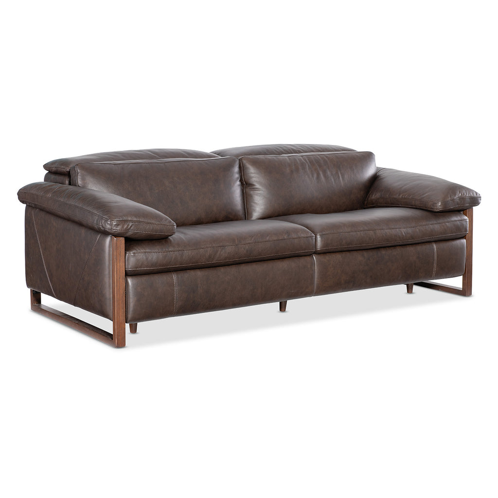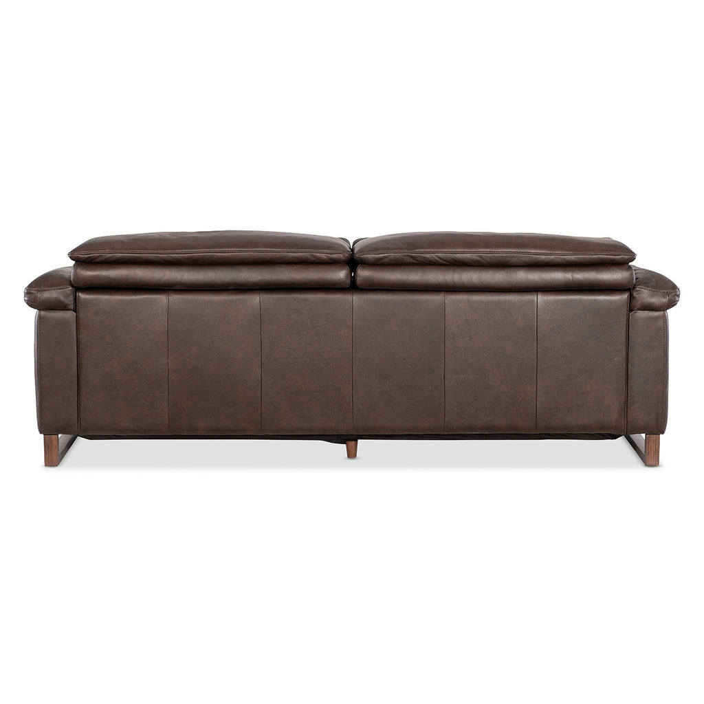Oversized comfort meets tailored function in the Jericho Power Sofa. Upholstered in Dallas Americano leather, it features plush pillow arms, wood-framed sides with a sleigh silhouette, and discreetly placed power controls. With a power headrest and USB port, this sofa redefines laid-back luxury. Hooker Furniture Upholstery is a designer-inspired collection of upscale leather seating that includes versatile reclining chairs, modern-day reclining sofas, eclectic club and artisan accent chairs, as well as a selection of executive desk chairs for the home. Designed and curated to appeal to a variety of style tastes, each piece from Hooker Furniture Upholstery is meticulously crafted in a unique selection of textures and hues.