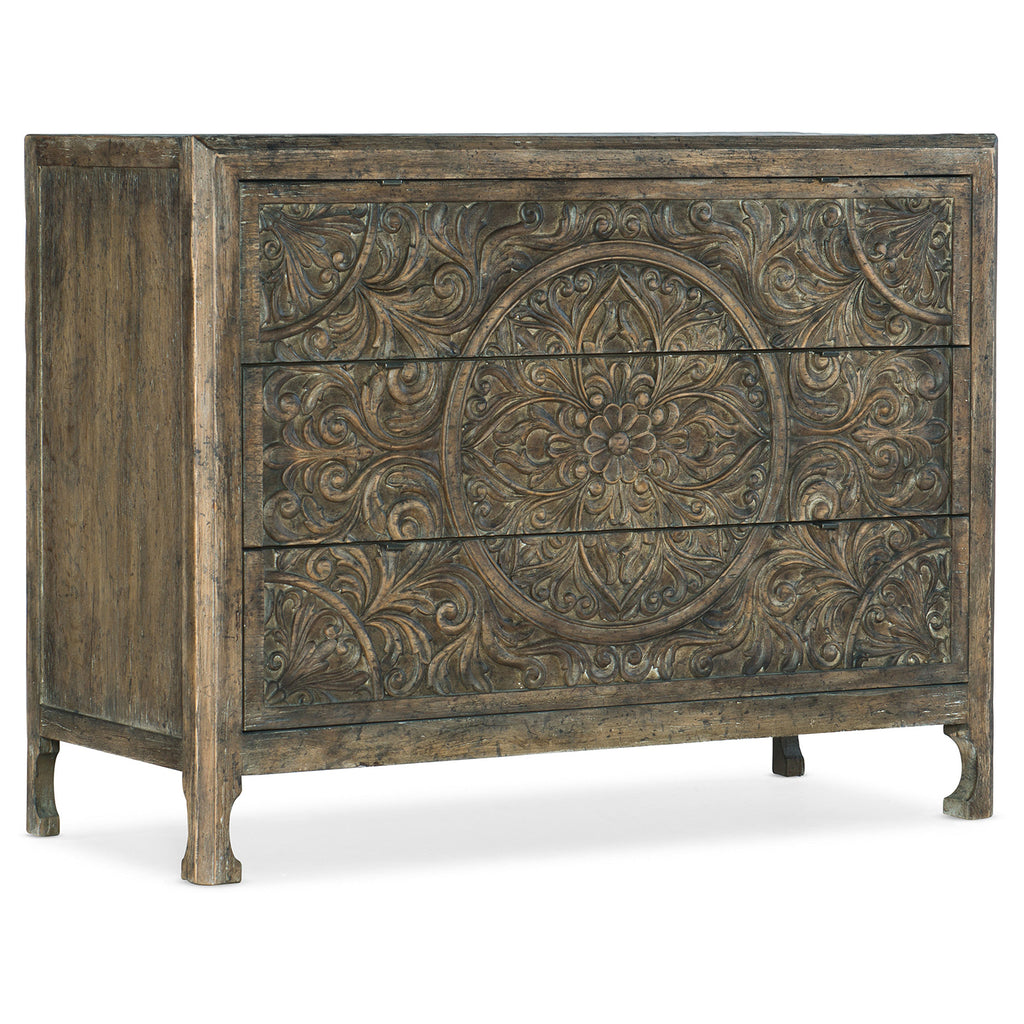 Rustic, romantic and rooted in authentic American character, the Lockhart Accent Chest exudes style savvy with carved drawer fronts punctuated by a circle motif in the center of the case is inspired by antiques found in the Hill Country of Texas. Subtle antique pewter-finished finger tab metal pulls add a finishing touch.