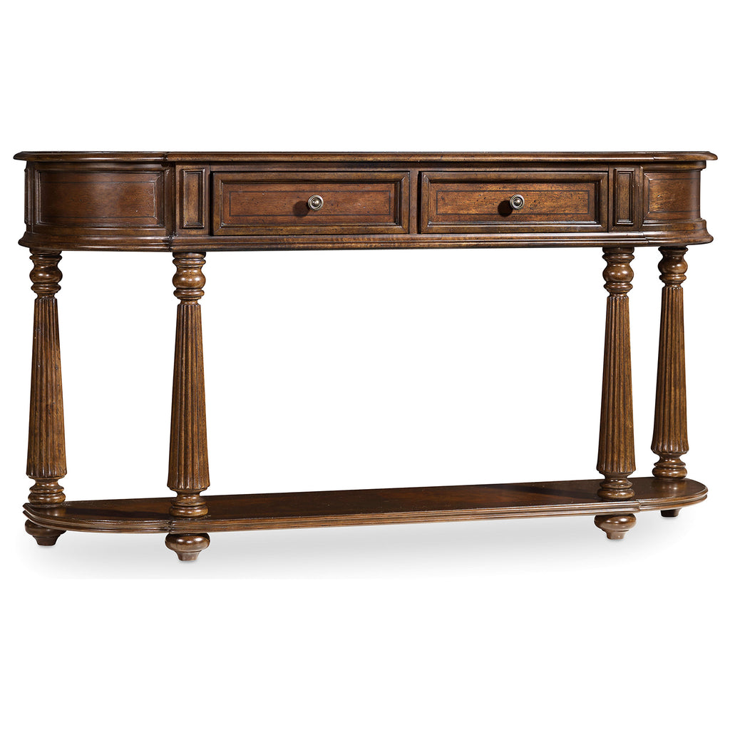 Bring symmetry, style and class to any room with the graceful silhouette of the Leesburg Demilune Hall Console. Featuring two drawers and a roomy bottom shelf, the console is only 14 inches deep so that it can add flair to even tight spaces. Crafted and Swirl Mahogany and Ebony Veneers, the Leesburg Console has a rich finish with elegant cathedral and swirl mahogany veneers with light physical distressing.