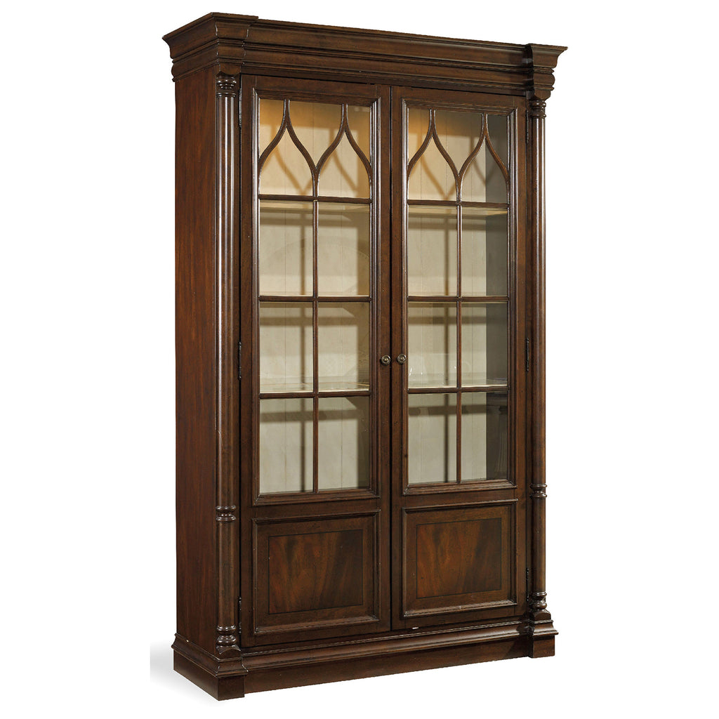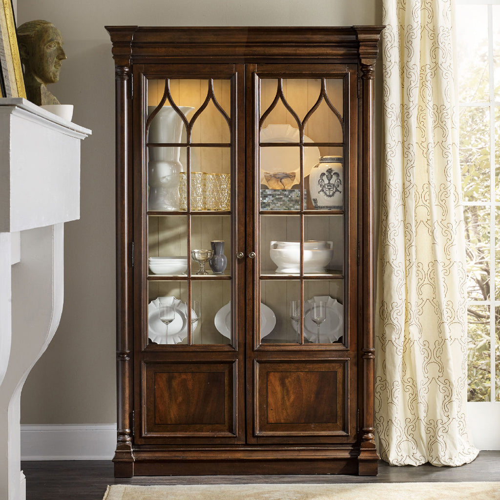 A stunning focal point piece, the Leesburg Display Cabinet has beautiful arched fretwork in the glass doors and a contrasting antique white finish on the back panel and 3 adjustable shelves. Two interior can lights are activated by a touch switch. Column motifs and a rich traditional mahogany finish with elegant cathedral and swirl mahogany veneers with light physical distressing create classic style with a fashionable flair.