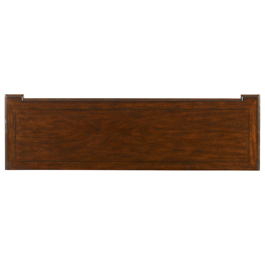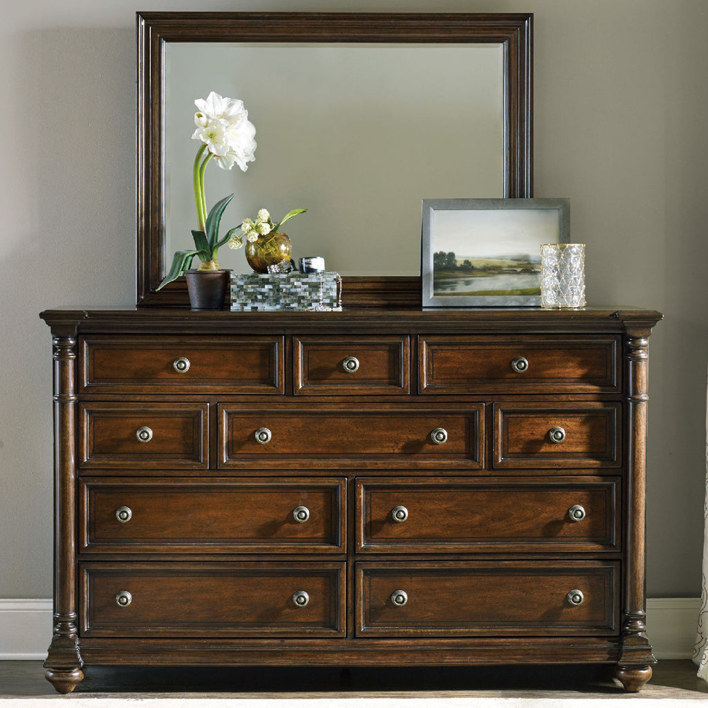 Stately, stylish and striking, the Leesburg Dresser brings a graceful focal point to your room and is loaded with practical function. Featuring 10 drawers, the dresser has a drop-in felt liner in the right drawer, hidden storage in the third drawer on the left, a drop-down top left drawer with wire management and a jewelry tray in the top center drawer, along with cedar-lined bottom drawers. Finished in a rich mahogany finish with elegant cathedral and swirl mahogany veneers with light physical distressing.