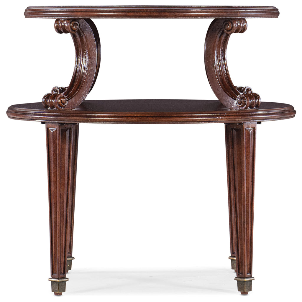With flair and grace, the two-tiered Charleston Side Table has two surfaces separated by decorative carved wood scrolls in all 4 corners. This distinctive piece has antique bronze metal ferrules on the feet, tapered legs, carved accents and an inlay border on the top. Crafted of Cherry Veneers with Walnut Inlay, it is finished in Maraschino Cherry using natural grain Cherry Veneers showcasing cathedral patterns in the wood.