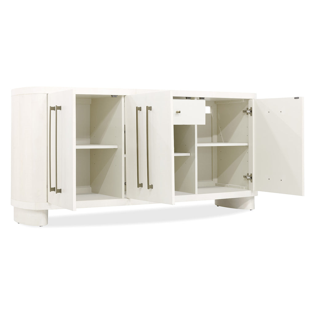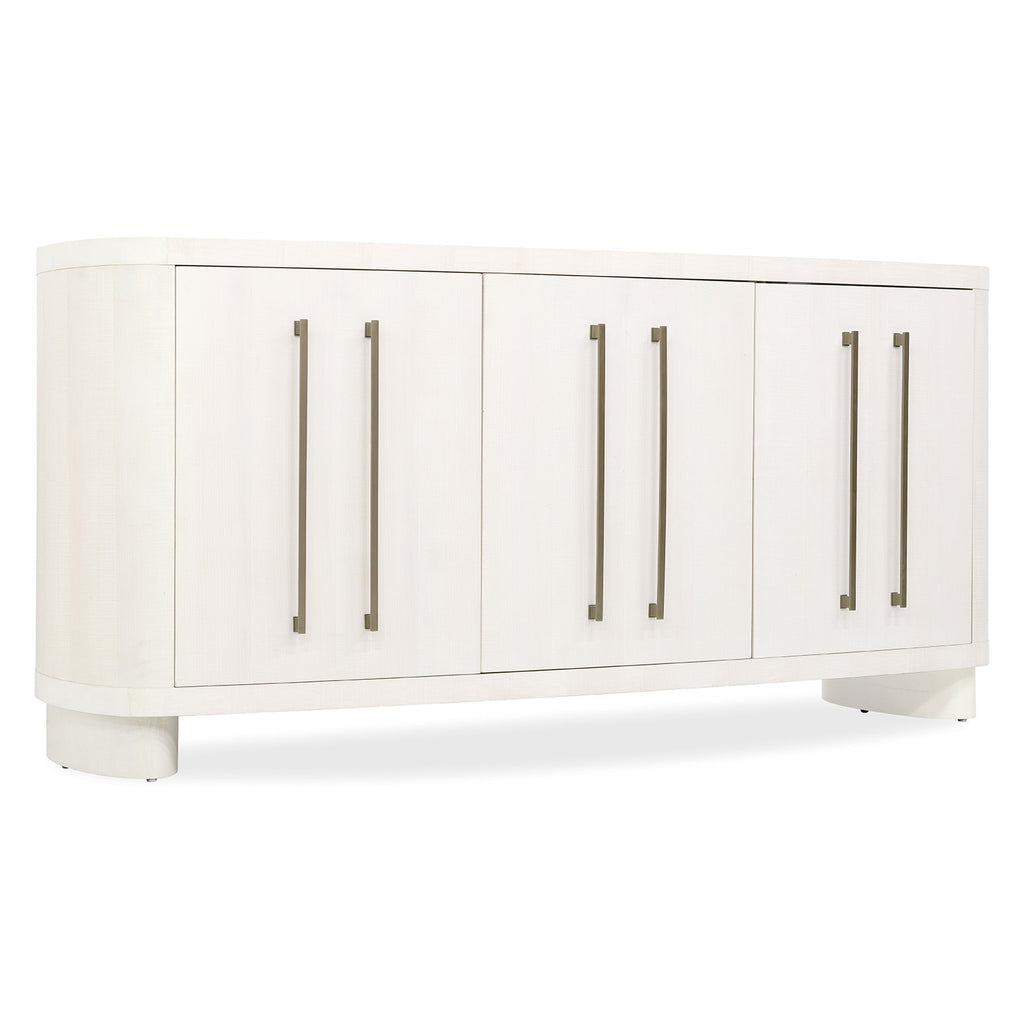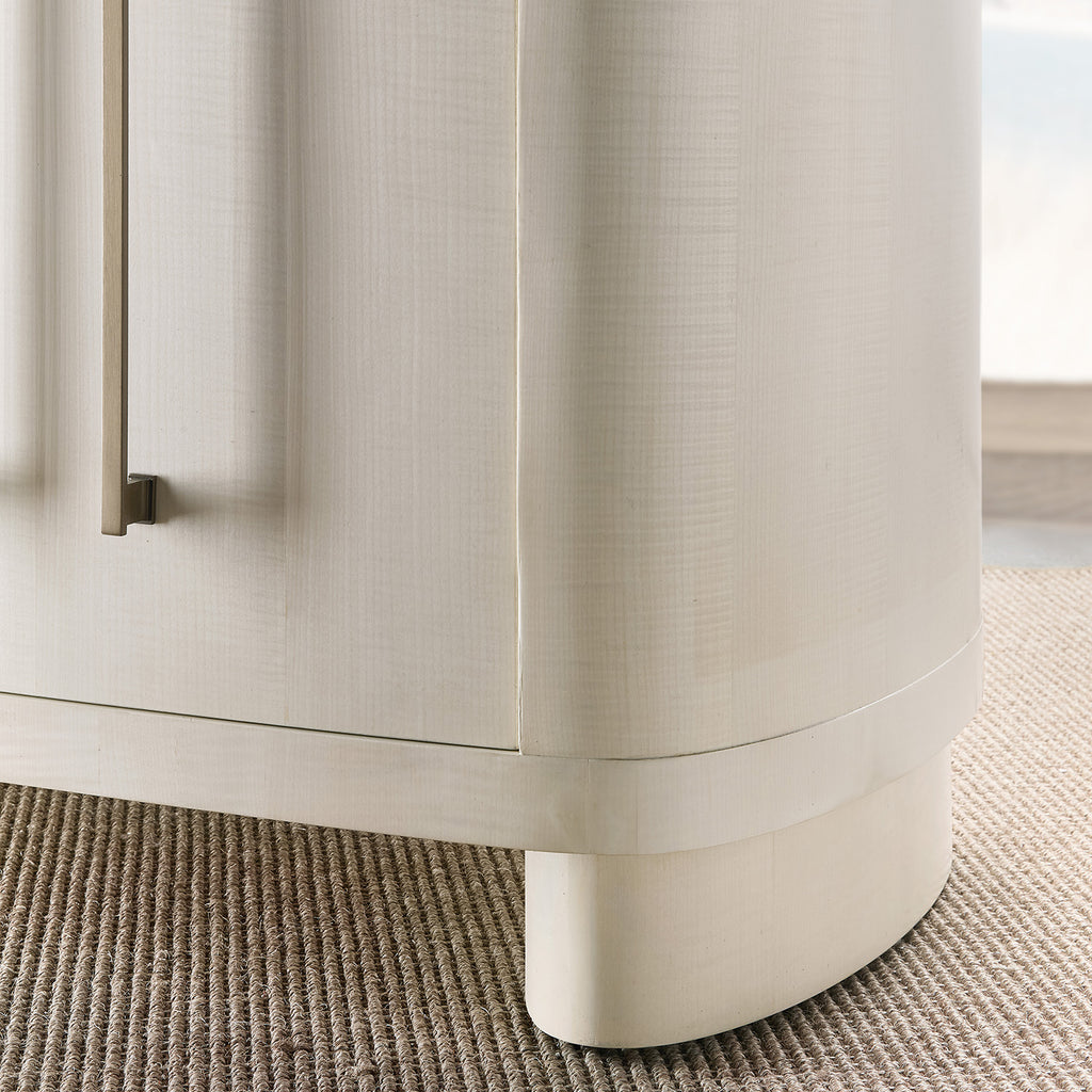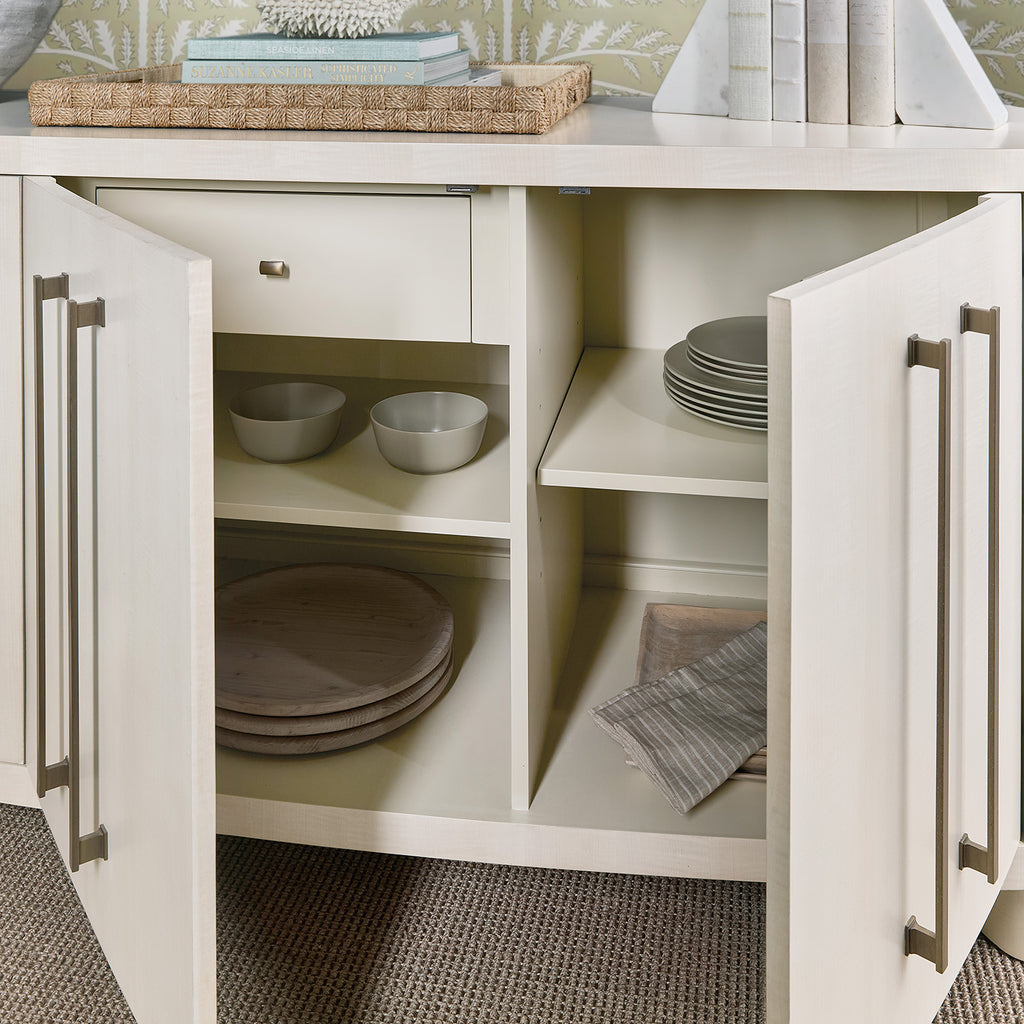 A curvaceous silhouette meets functional elegance in the Bar None Credenza. With soft-close doors, a silverware tray, and ample hidden storage, this piece shines in a crisp white finish over figured maple veneers—perfect for dining rooms or living spaces. Come closer to Melange, and you will discover something unexpected, something far more than an accent furniture collection offering a multitude of finishes. An eclectic blending of colors, textures and materials in a vibrant collection of one-of-a-kind artistic pieces, Melange is meant to inspire you and fuel an experience of self-discovery. Melange can provide that spark needed to begin the transformation of a room and a renaissance in your life. Each piece of Melange has its own story. The designs are versatile and timeless, easily transcending from one life stage to the next, from home to home and generation to generation.