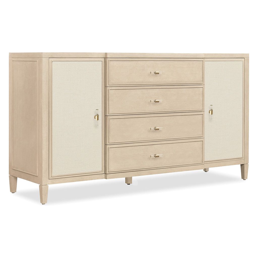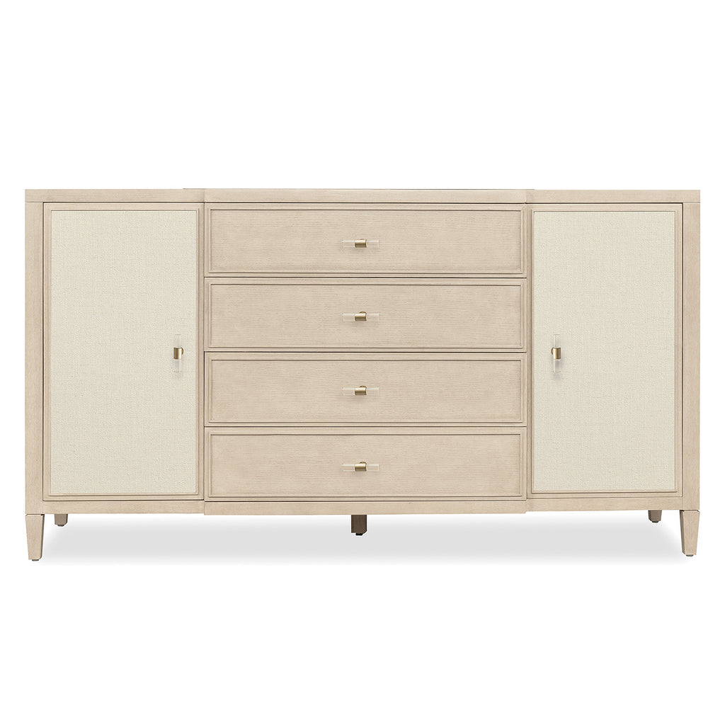 Refined and richly detailed, the Be My Guest Dresser blends fabric and wood with four soft-close drawers and two fabric-front cabinet doors. A cedar-lined bottom drawer and jewelry tray complete this elegant bedroom essential. Come closer to Melange, and you will discover something unexpected, something far more than an accent furniture collection offering a multitude of finishes. An eclectic blending of colors, textures and materials in a vibrant collection of one-of-a-kind artistic pieces, Melange is meant to inspire you and fuel an experience of self-discovery. Melange can provide that spark needed to begin the transformation of a room and a renaissance in your life. Each piece of Melange has its own story. The designs are versatile and timeless, easily transcending from one life stage to the next, from home to home and generation to generation.