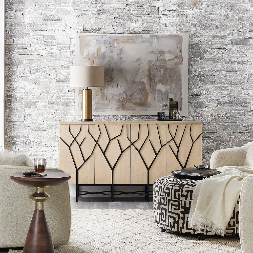 Organic yet sleek, modern yet nostalgic, the Melange Branched Four-Door Entertainment Center contrasts a light wood finish on Maple Veneers with a black metal base and twig motif on the door fronts. The entertainment center accommodates up to a 65-inch TV, and features 4 doors with push latches and soft close hinges. Behind the left and right-side doors are two adjustable shelves, and there’s a drawer and open shelf area behind the center doors. Three plug electrical outlet included.