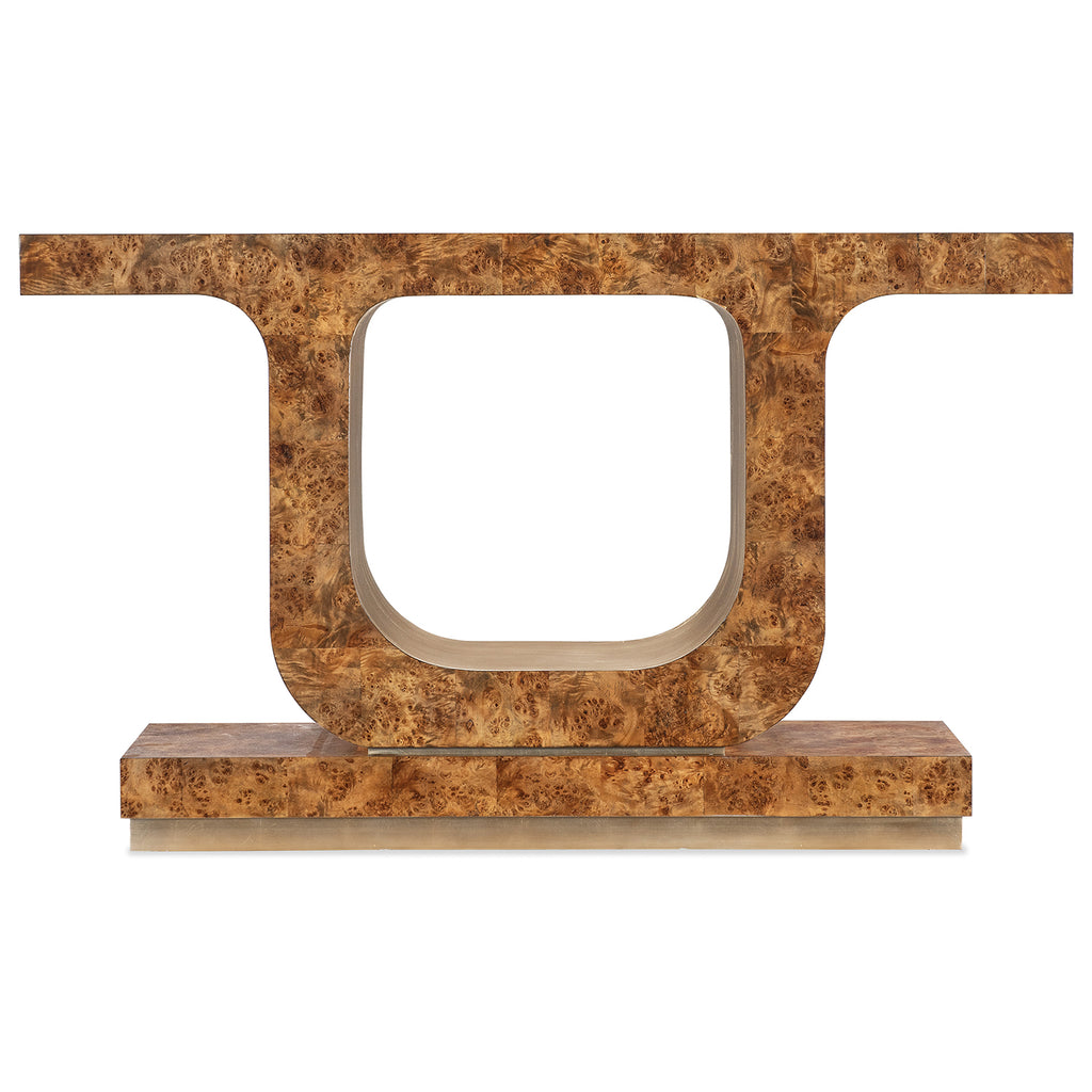 Rich, warm and earthy Mappa Burl Veneers in a tiled pattern are enhanced by an elegant gold plinth base and gold leaf accents on the Burlesque Console Table. Organic yet glamorous, the console table measures 60 inches wide by 15 inches deep.