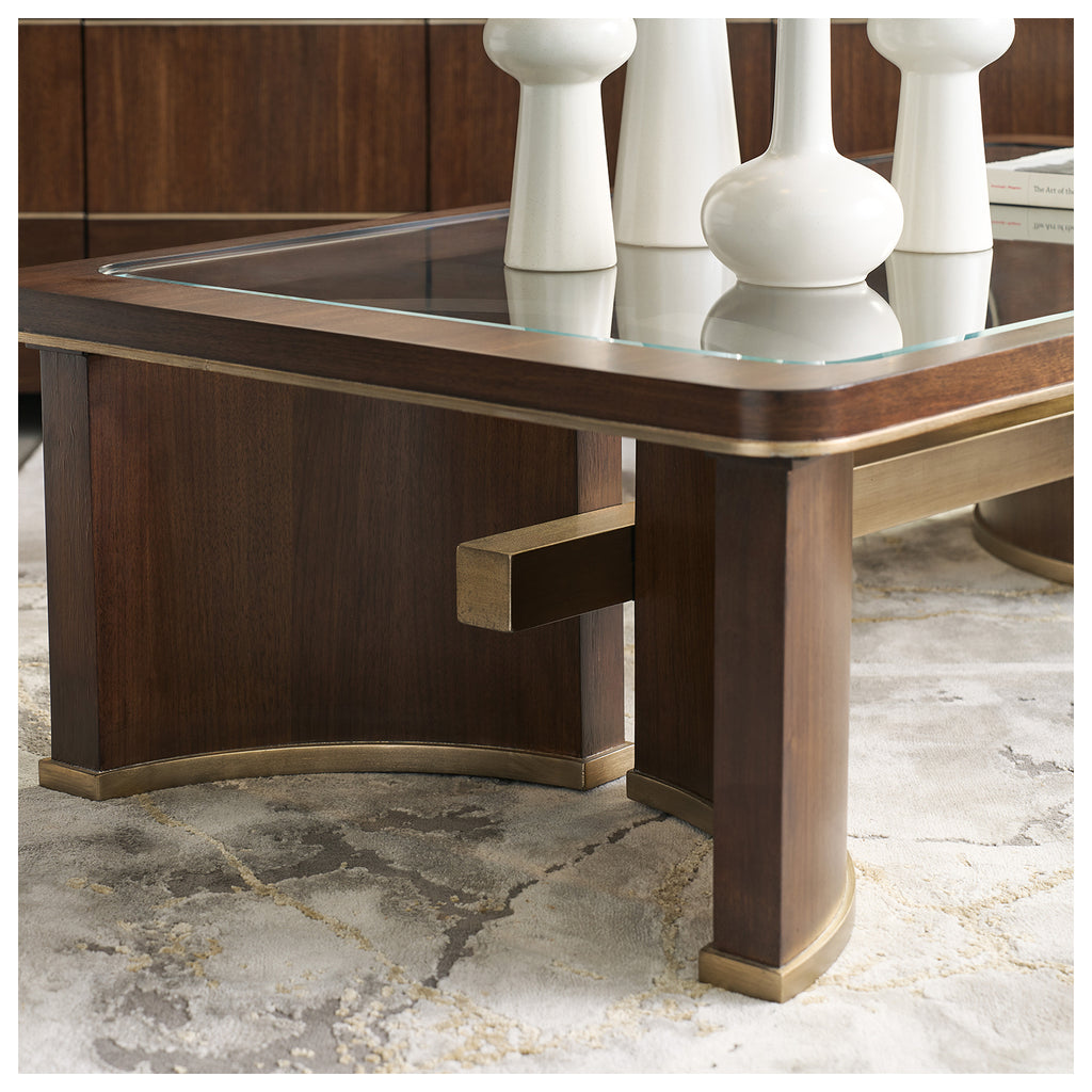 Classy and timeless, the Contours Cocktail Table combines Walnut Veneer, champagne accent trim and a white tempered and beveled glass insert on the wood-framed top. With champagne-finished accent trim, legs and a stretcher, it has a rectangle shape and measures 66 inches wide by 36 inches deep.