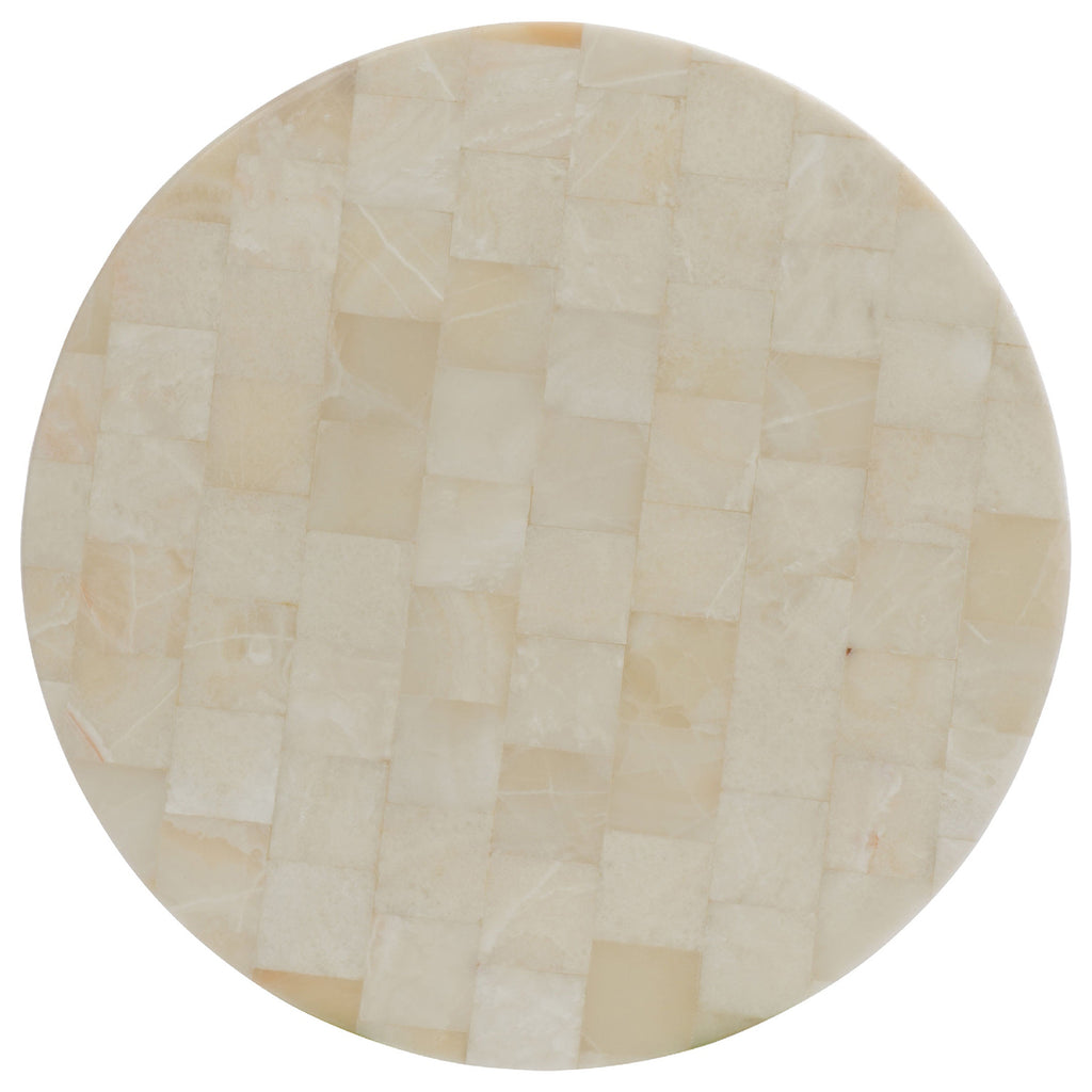 Light and airy, sleek and chic, the Corrina Cocktail Table is distinguished by a delicate fretwork metal base in a gold leaf finish topped by a round white onyx top of organic elegance.
