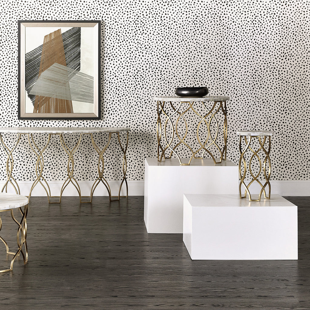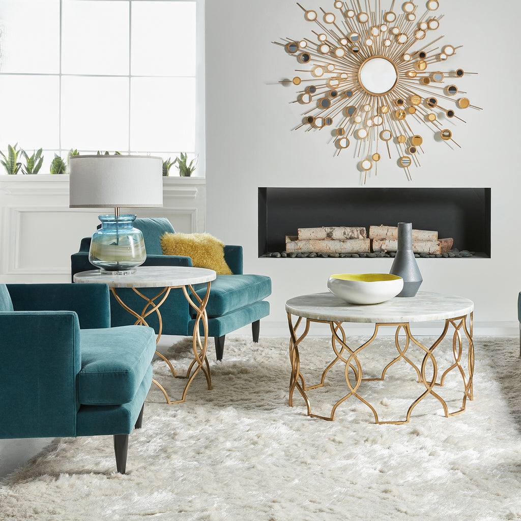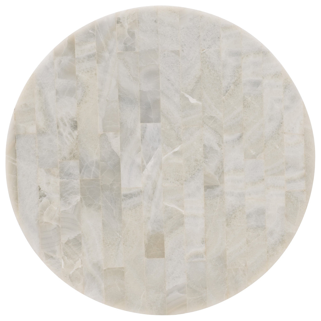 Add a sparkle of timeless Art Deco style to any living space with the Mélange Corrina Lamp Table, blending a gold-leaf metal fretwork base with a White Onyx Parquet top for an airy and uplifting look.