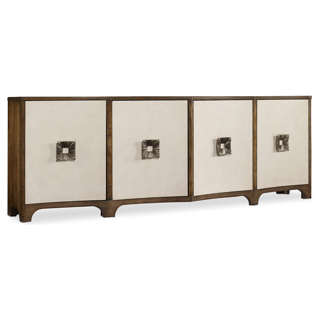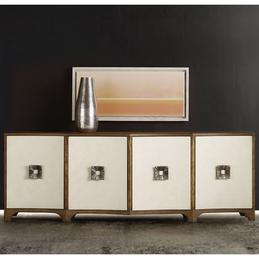 The Mélange credenza has four doors with large square hardware. It can also be used as an entertainment console.