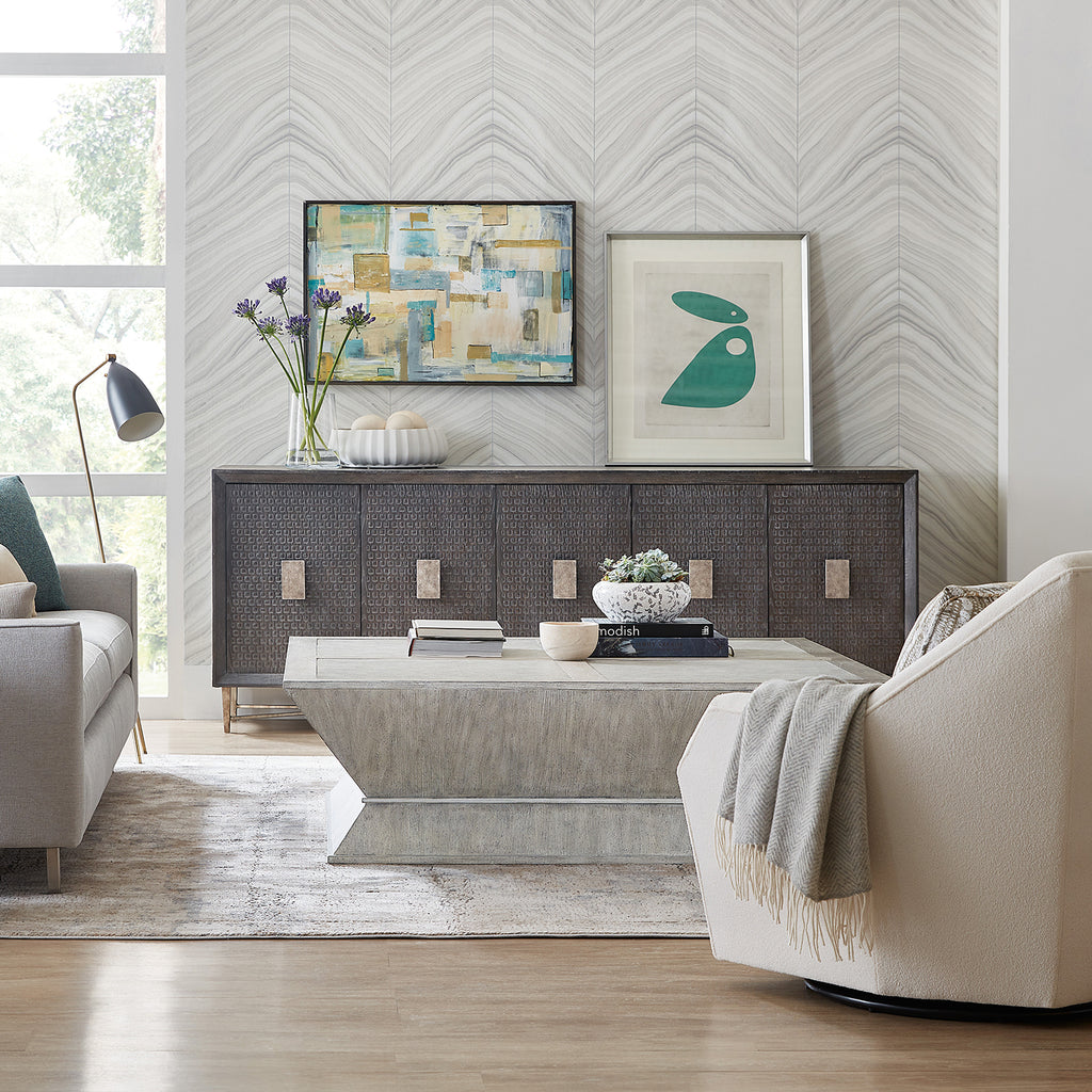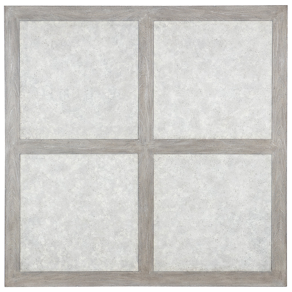With a chic chunky shape and four paned stone-like panels on the top, the Korena Cocktail Table has a casual organic look with a serene gray finish over Elm Veneers and resin.
