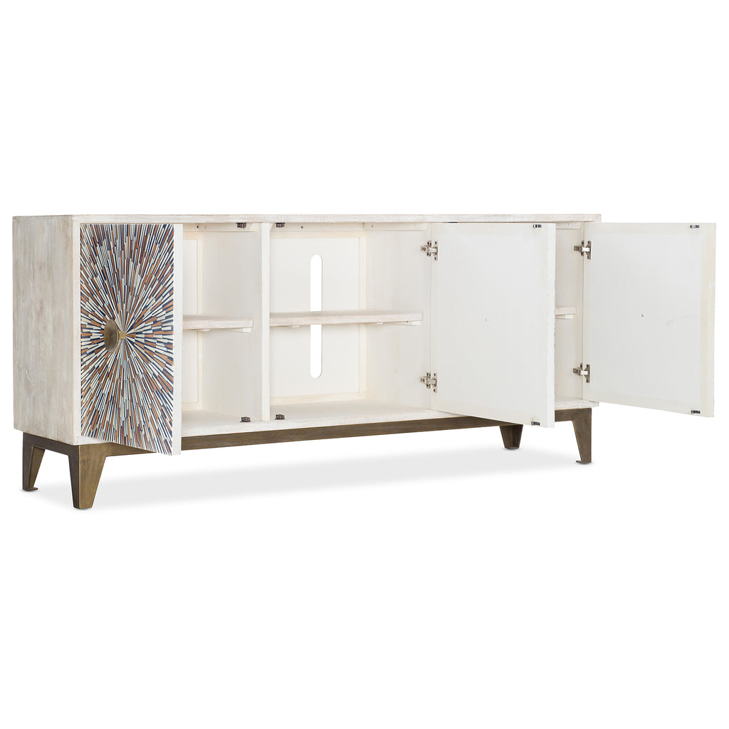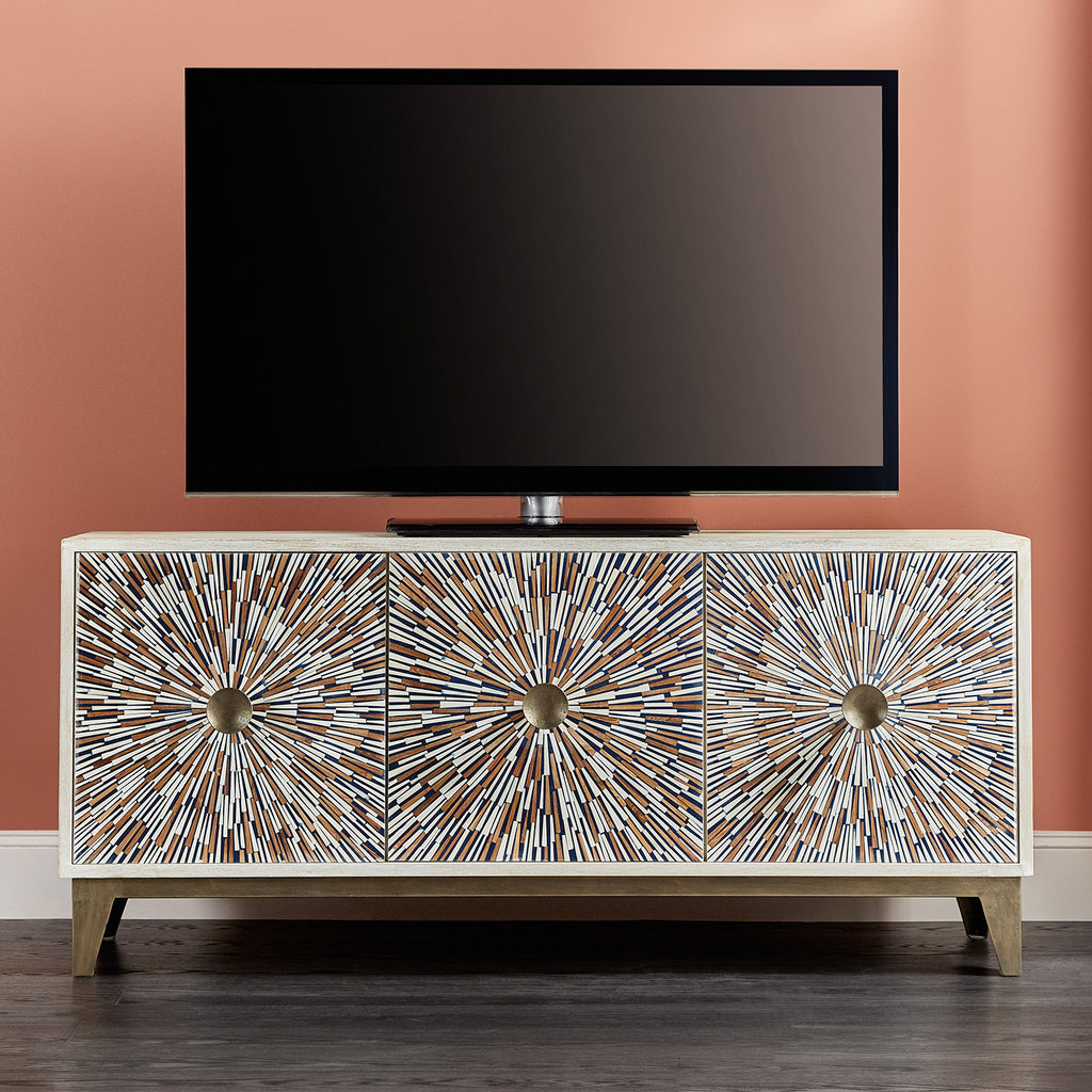 Create an atmosphere of celebration every day with the uplifting Liberty Entertainment Console, featuring a festive starburst bone inlay pattern in colors of white and blue and brown. Gold provides a sparkling accent color on the metal base and hardware. This functional piece, crafted of Mango Wood with bone inlay and iron has one removable shelf behind each door and a ventilated back panel. Accommodates up to a 70-inch flat screen TV.