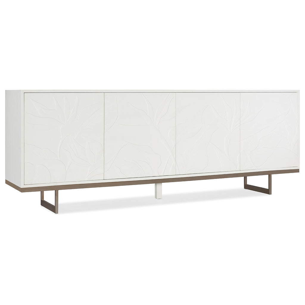 The Passerine Credenza combines a delicate raised floral motif on the front with a pristine white finish and a gold metal base. The four doors have easy touch latches and two adjustable shelves behind each pair of doors. Combining form and function, the credenza offers a ventilated back panel, wire management holes in the back panel and a power supply. Crafted of hardwoods with resin and metal.