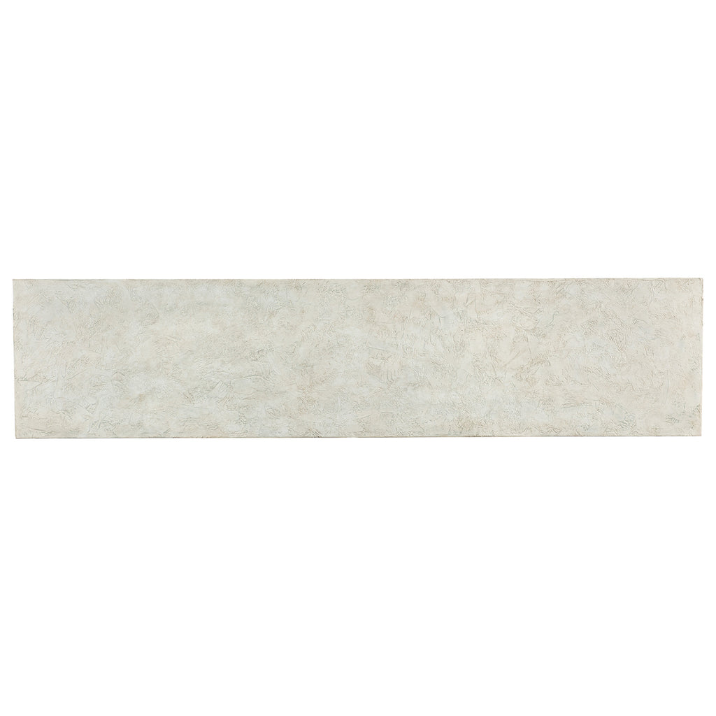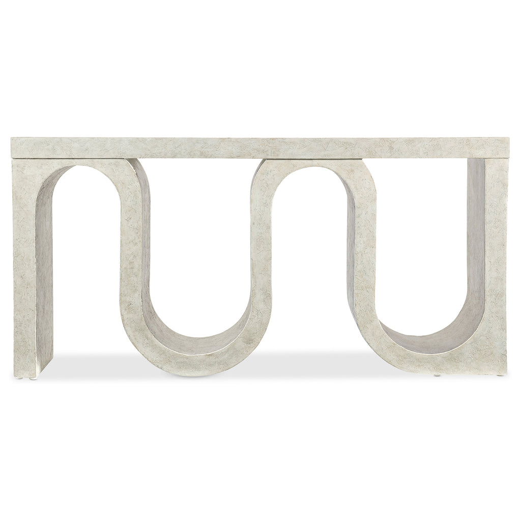 A cream-colored textured finish is paired with a curvy curled-ribbon-like base to create a narrow rectangle-shaped table that is chic, casual and tactile.