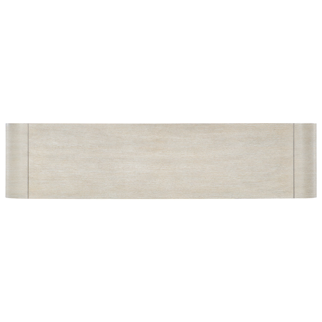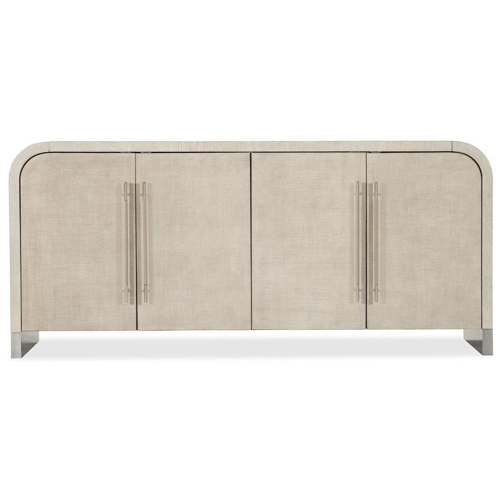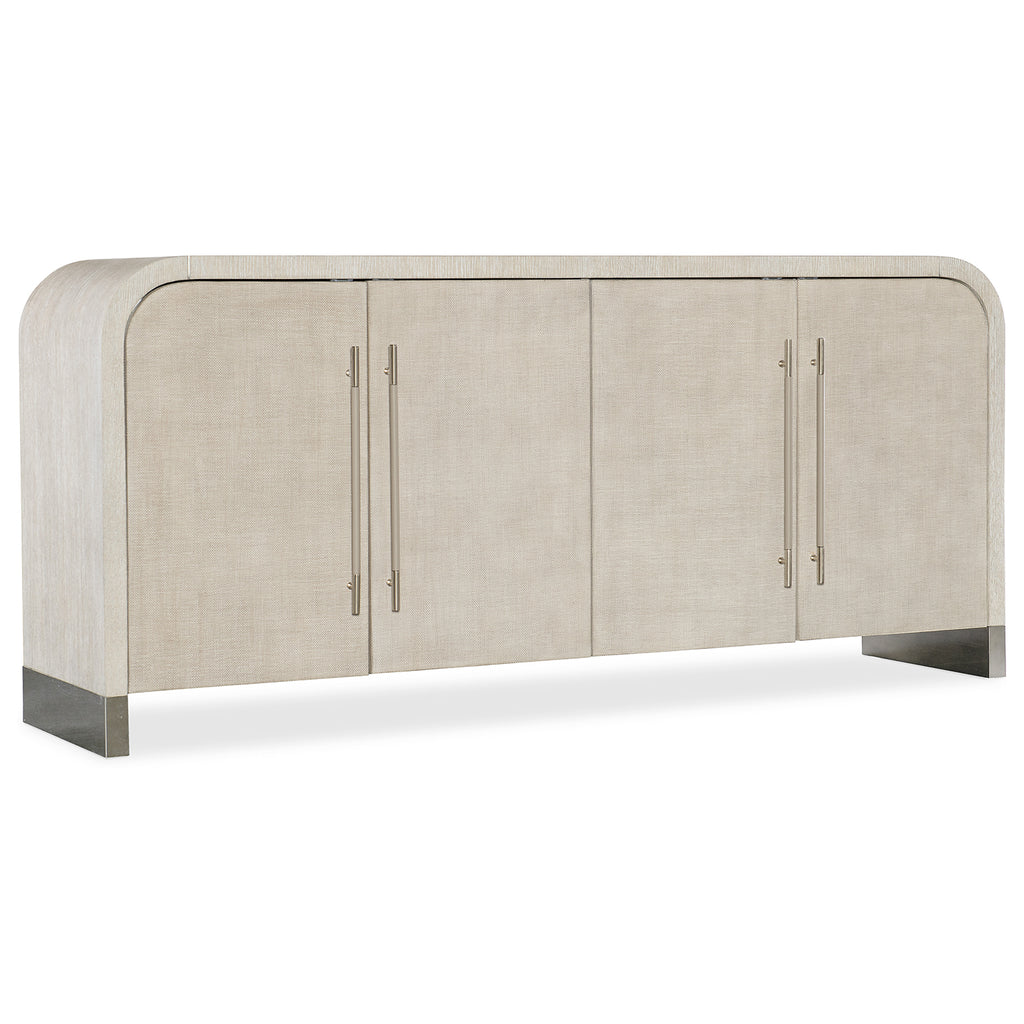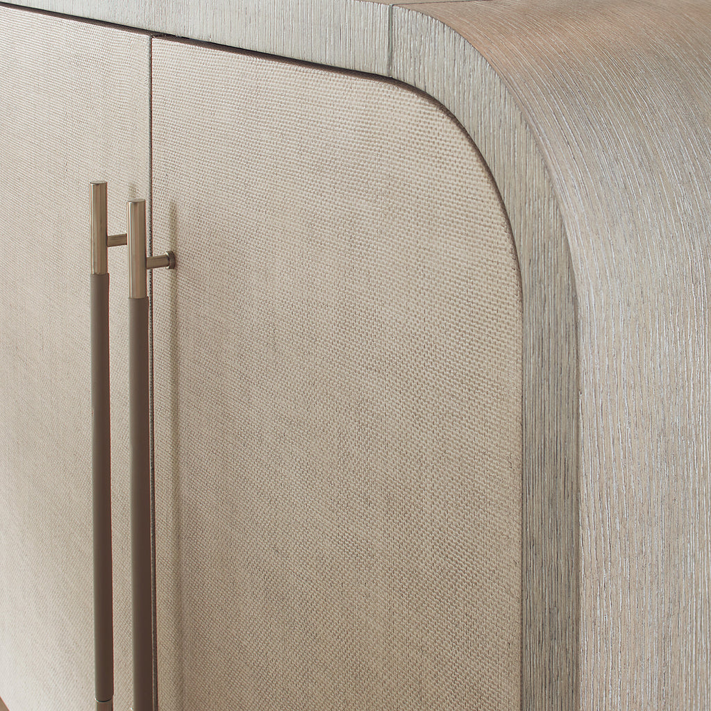 Sleek and stunning with a timeless sophistication and soft modern aesthetic, the Modern Mood Buffet combines Quartered Oak Veneers with raffia-wrapped doors, warm pewter brushed metal bar pulls accents. Features include 4 doors with soft-close hinges and magnetic catches, two adjustable wood shelves behind each pair of doors, ventilated back panels and wire management holes in the back panel and a 3-plug electrical outlet behind the right-side doors.