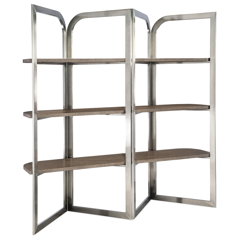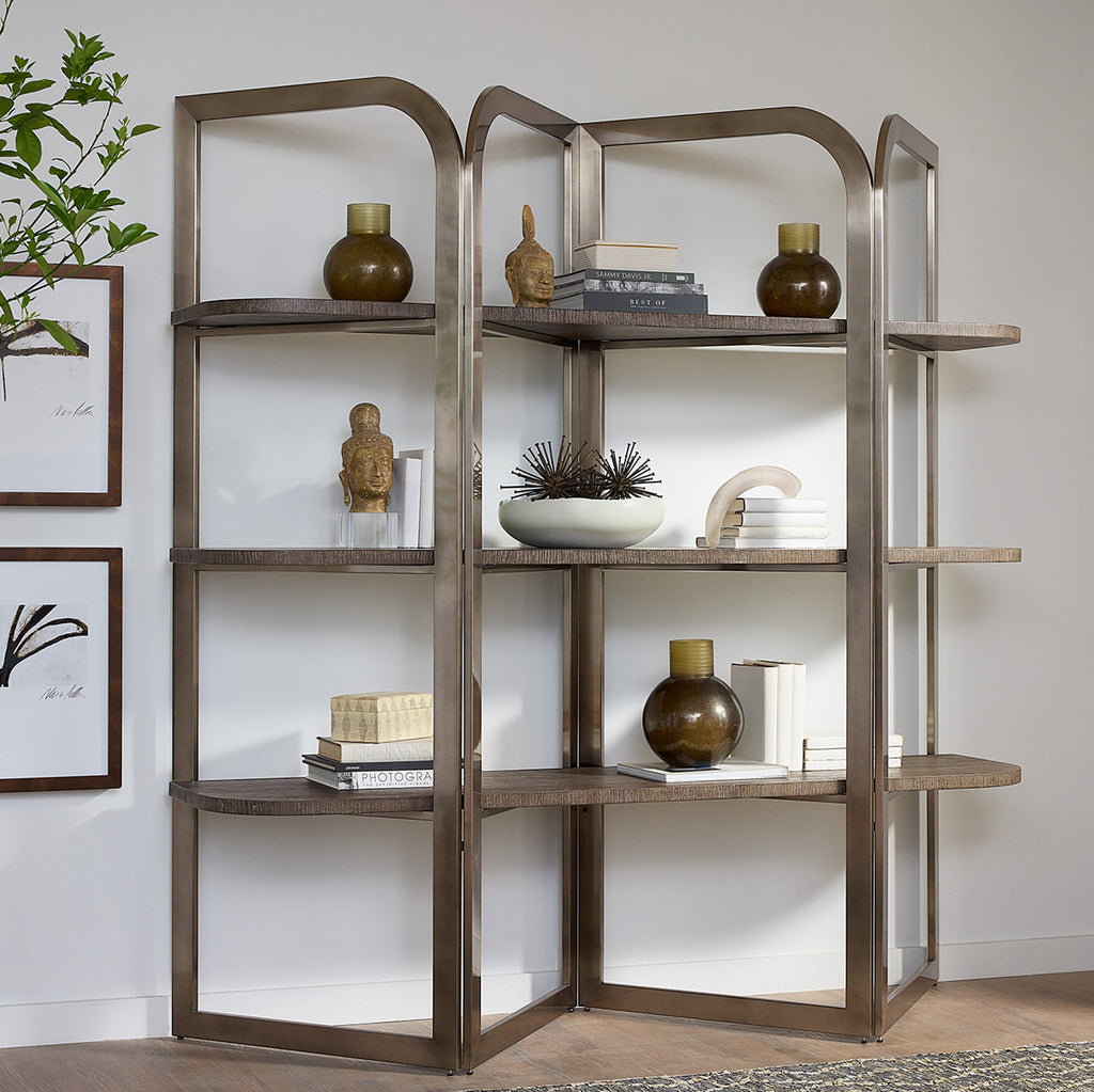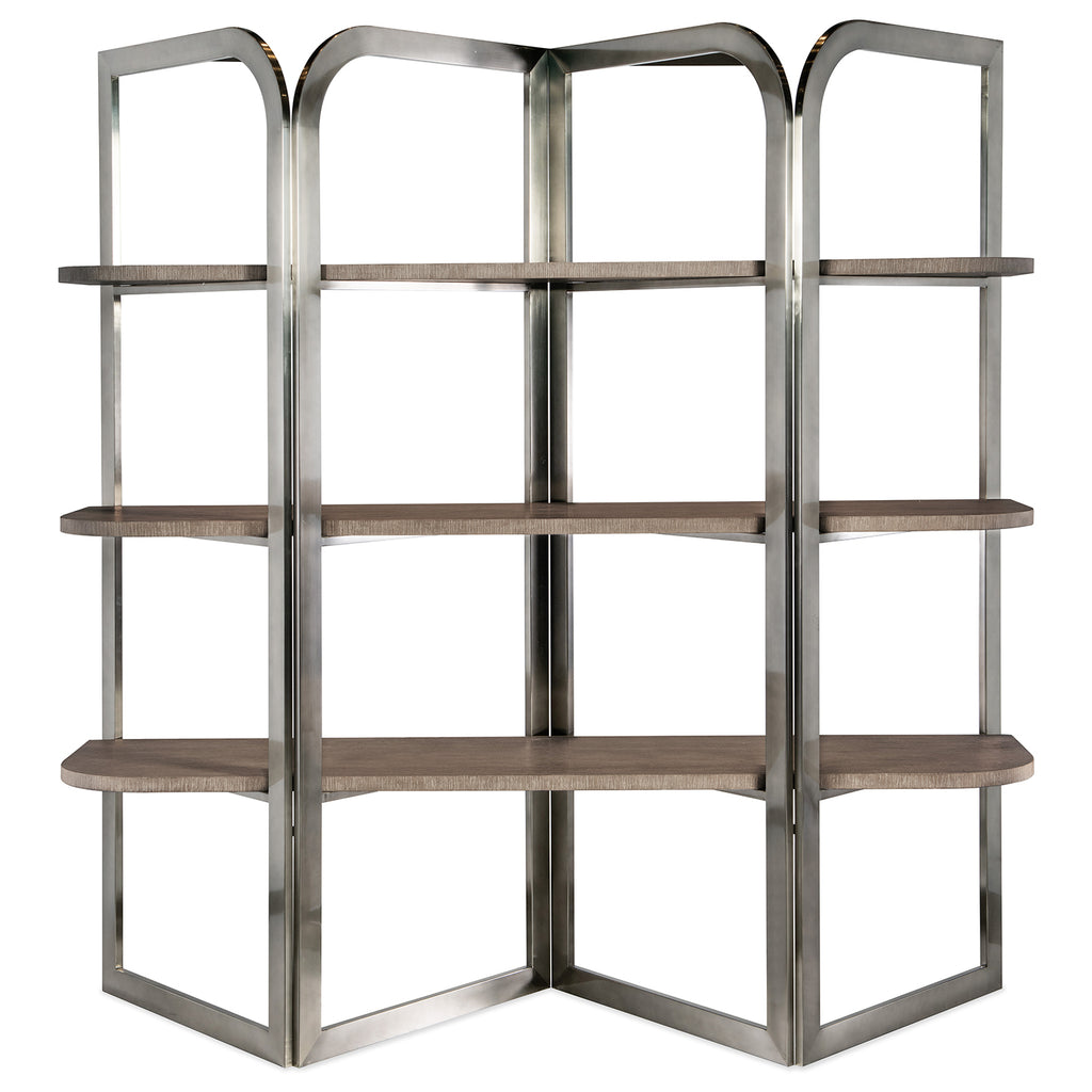 Architectural and artistic with a luxe mixture of materials, the Modern Mood Etagere has three fixed shelves crafted of wire-brushed Quartered Oak. The shelves are surrounded by a shaped brushed metal frame in a warm pewter-colored finish. Finished all the way around, the shelf can be used from either side and can float in a room.