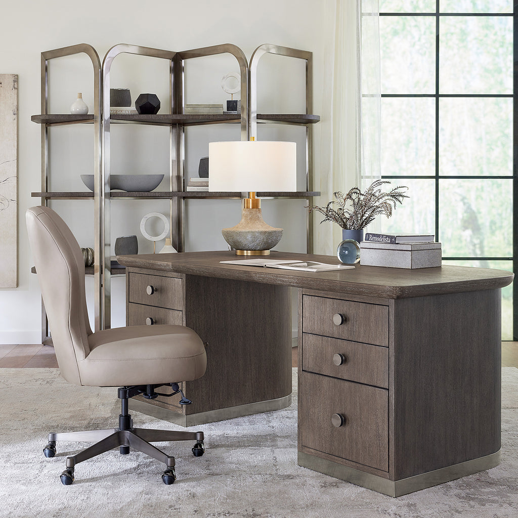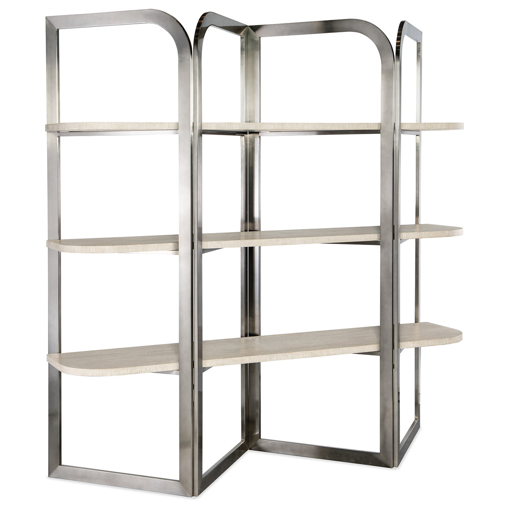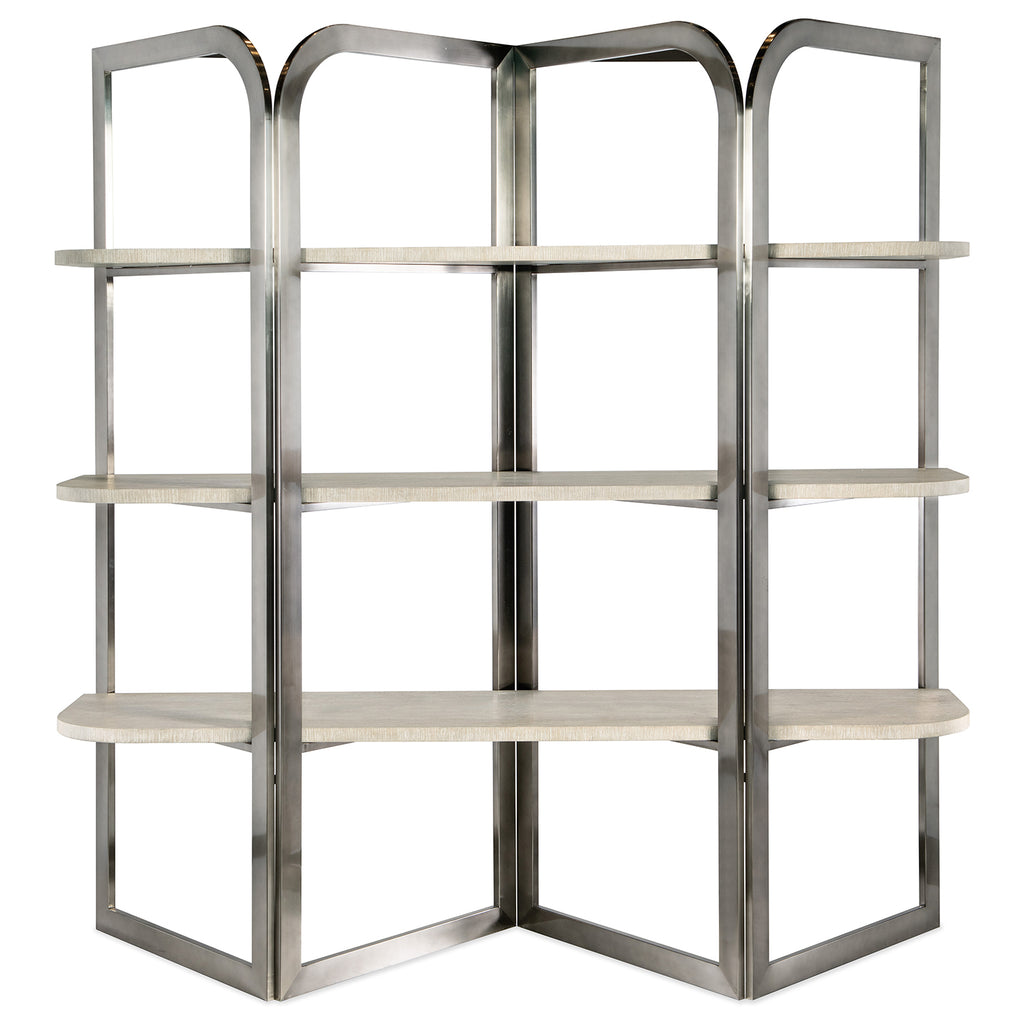 Architectural and artistic with a luxe mixture of materials, the Modern Mood Etagere has three fixed shelves crafted of wire-brushed Quartered Oak. The shelves are surrounded by a shaped brushed metal frame in a warm pewter-colored finish. Finished all the way around, the shelf can be used from either side and can float in a room.