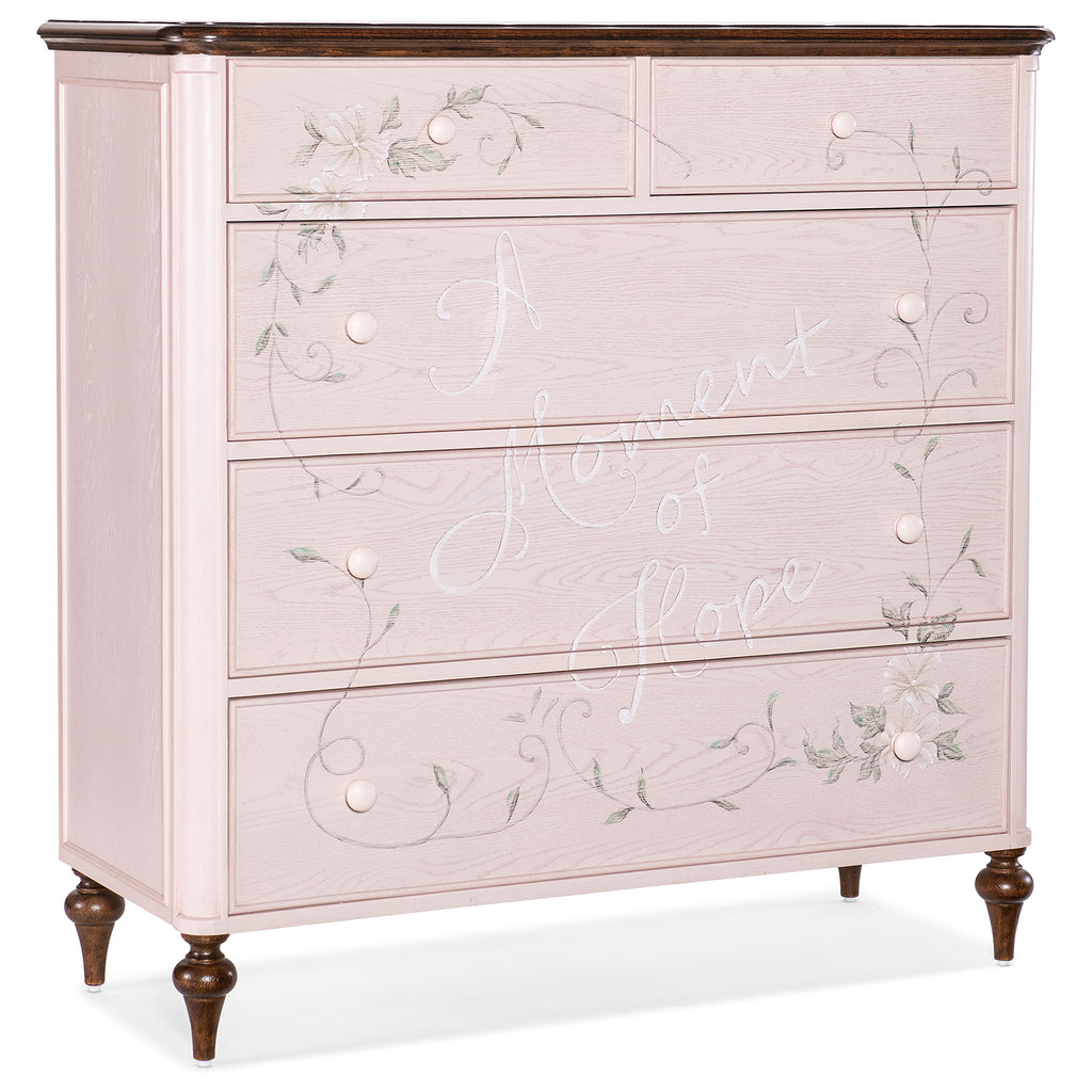 Beautiful and uplifting, the Moment of Hope Chest has a serene pink finish with handpainted lettering and delicate floral accents on the drawer fronts. The five self-closing drawers have creamy white interiors, and a contrasting wood finish is featured on the top and legs. Crafted of Oak and Walnut Veneers, the chest is part of a curated collection to honor the spirit and courage of those battling breast cancer, with a portion of the proceeds from each chest sold going to the Susan G. Komen Foundation.