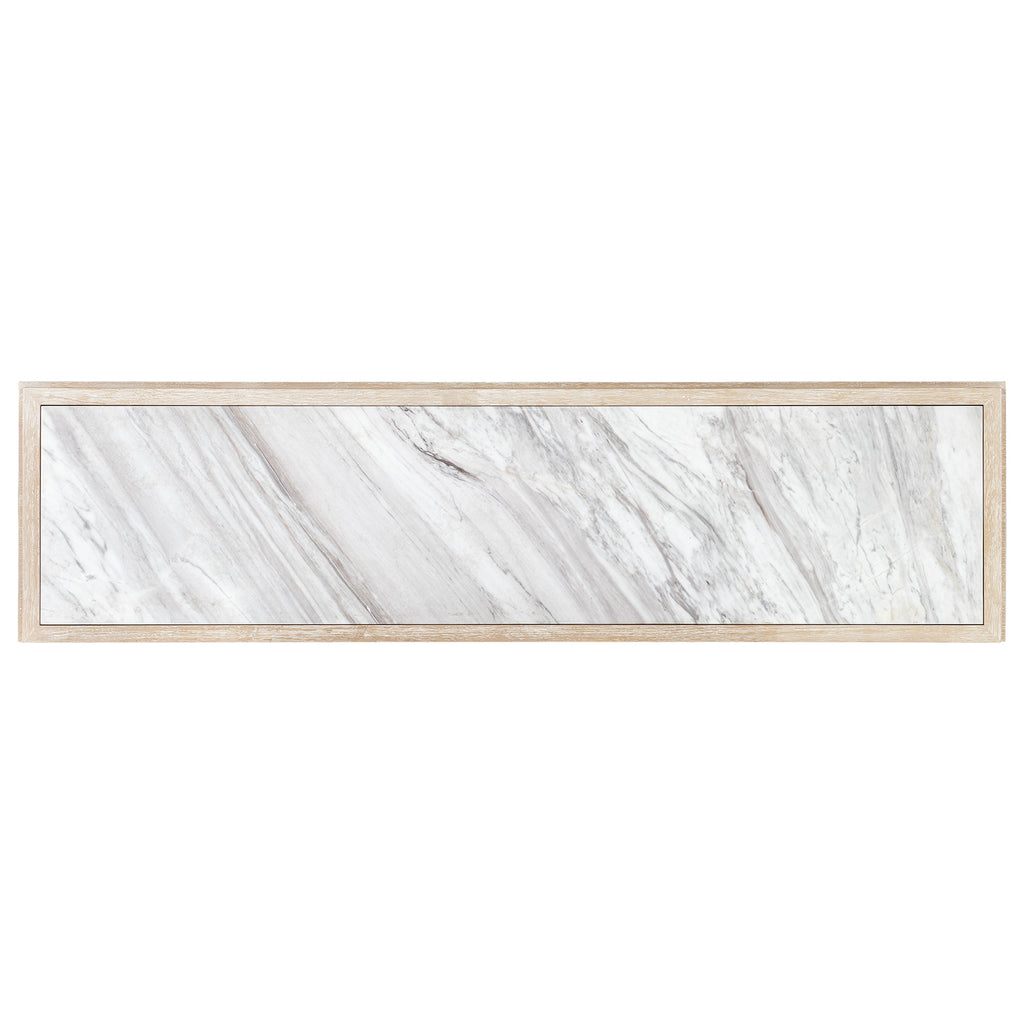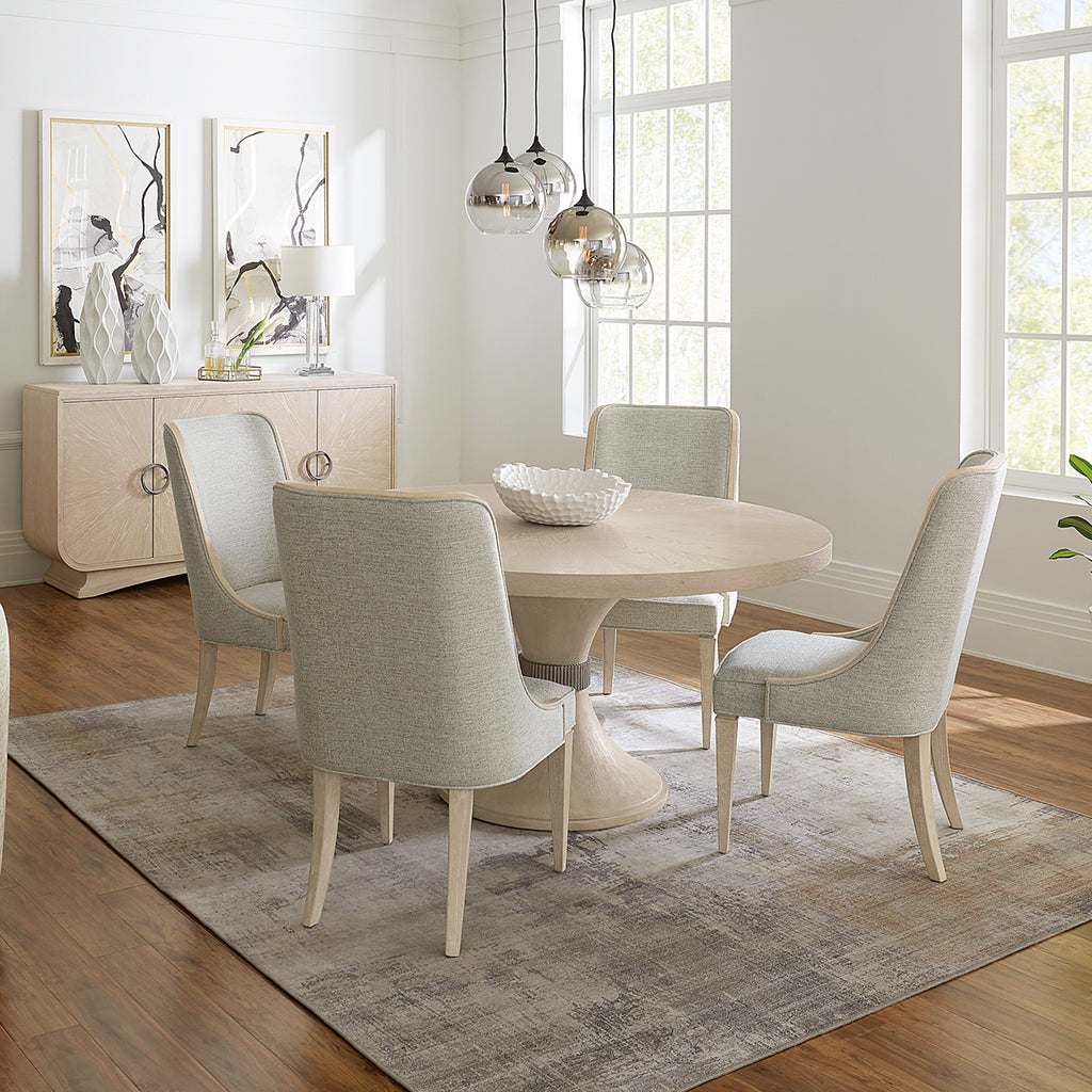 A brilliant fusion of classic architectural design elements, soft shapes and faux metal accents, the Nouveau Chic Buffet blends fashion and function. Crafted of Cathedral and Quartered Oak Veneers with a serene Sandstone finish, the buffet has four doors with soft-close hinges and magnetic door catches and one self-closing drawer behind each pair of doors. The left side drawer has a drop-in felt-lined silver tray, and there’s one adjustable shelf behind each pair of doors. Includes a ventilated back panel and a three-plug outlet behind the right door.