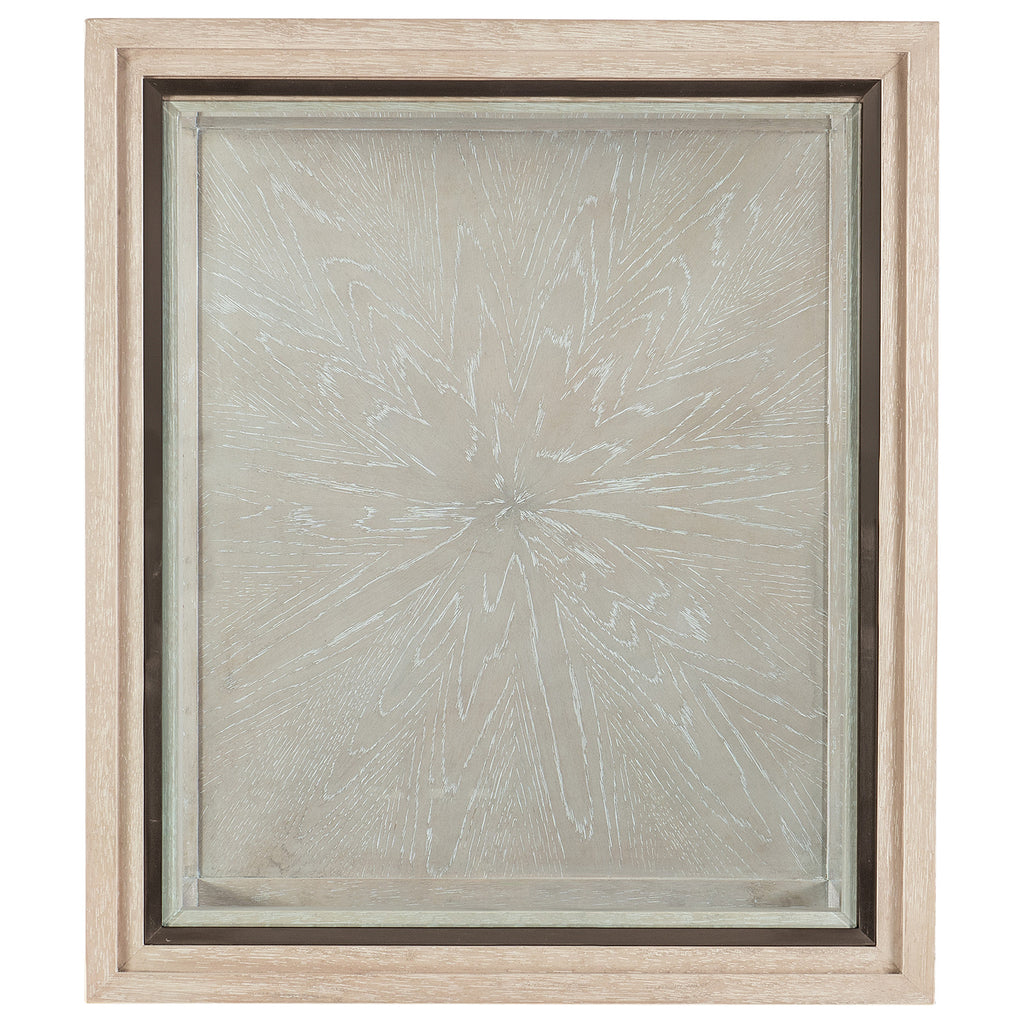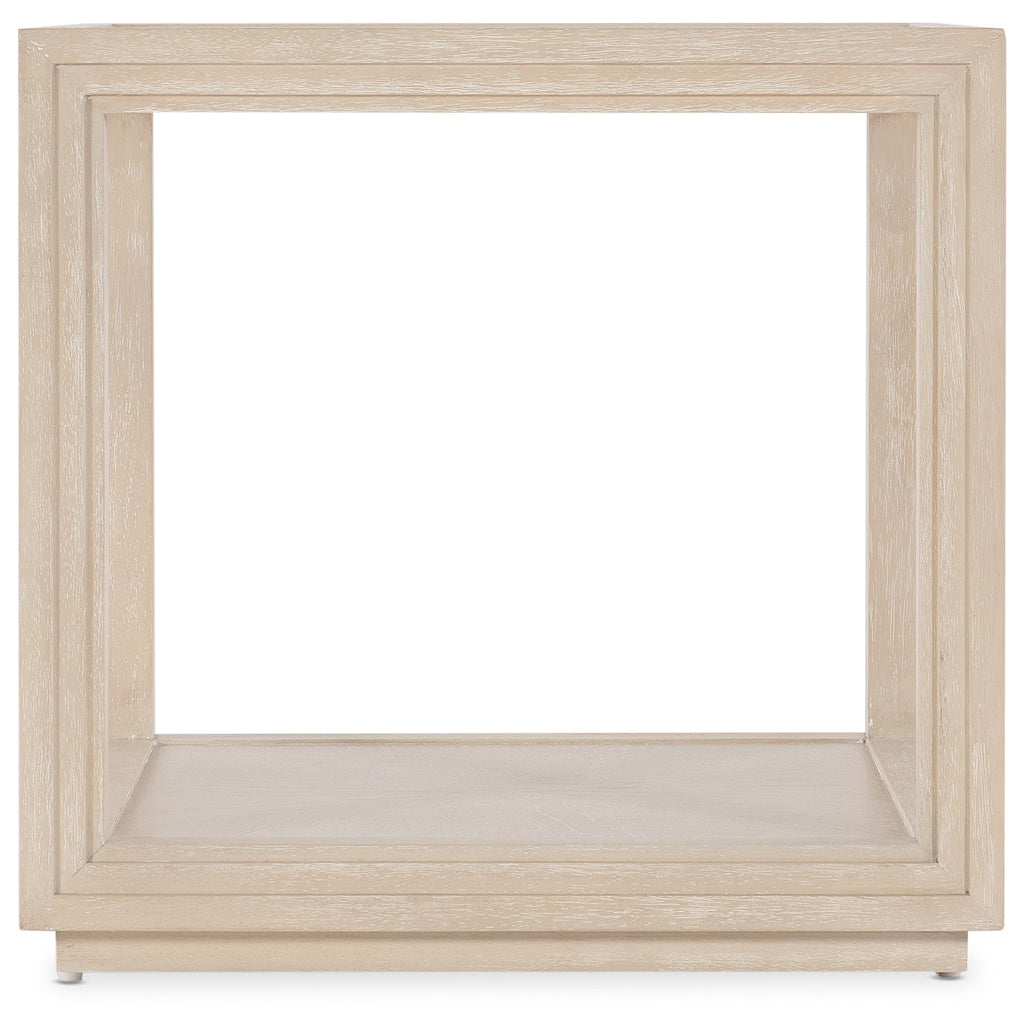 A brilliant blend of materials, the Nouveau Chic Rectangle End Table combines Oak Veneers, tempered glass and a metal frame. The beveled-edge glass top looks down onto the lower wood shelf featuring a dramatic sunburst veneer pattern. Finished in the serene Sandstone finish with light wire brushing for tactile appeal.