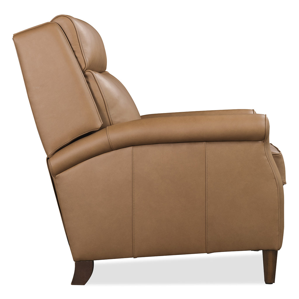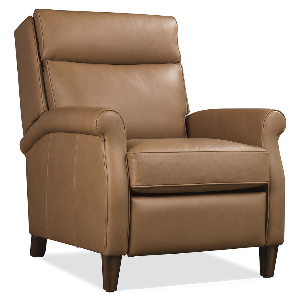The Randall Recliner in Billows Caramel leather offers classic elegance with modern functionality. Featuring power recline, a pop-up headrest, and USB port, this transitional design is anchored by rolled arms and dark wood tapered legs. Its bustle back and rich leather make it a refined yet cozy addition to any traditional or mixed-style interior. Hooker Furniture Upholstery is a designer-inspired collection of upscale leather seating that includes versatile reclining chairs, modern-day reclining sofas, eclectic club and artisan accent chairs, as well as a selection of executive desk chairs for the home. Designed and curated to appeal to a variety of style tastes, each piece from Hooker Furniture Upholstery is meticulously crafted in a unique selection of textures and hues.
