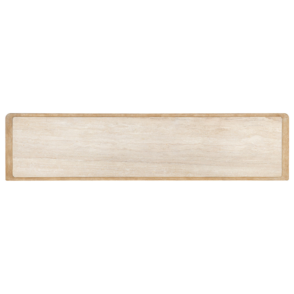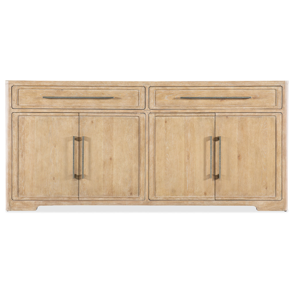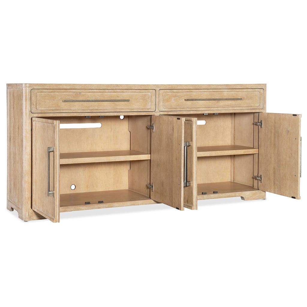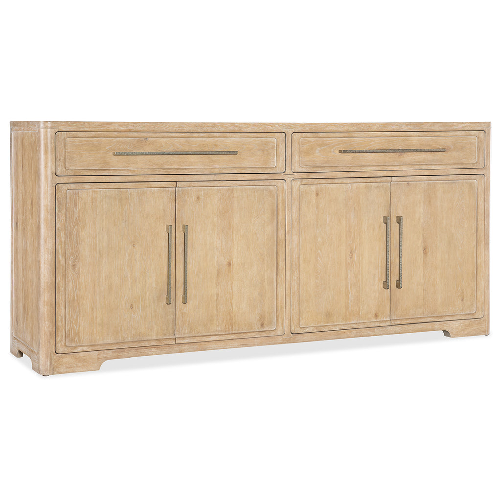 Serene and stylish with a modern twist, the Retreat Buffet offers a delightful mix of natural materials in a clean and sleek silhouette. The case is crafted of Oak and Maple Veneers with a Travertine Stone inlay top and a sand-colored Dune finish to showcase the unique grain patterns of the wood. The four doors have magnetic door catches and one adjustable shelf behind each. The two drawers have self-close drawer guides, and the top left drawer has a removable felt liner, while the top right drawer has a removable silverware tray. The textured, pewter-colored bar pulls add a dramatic accent.