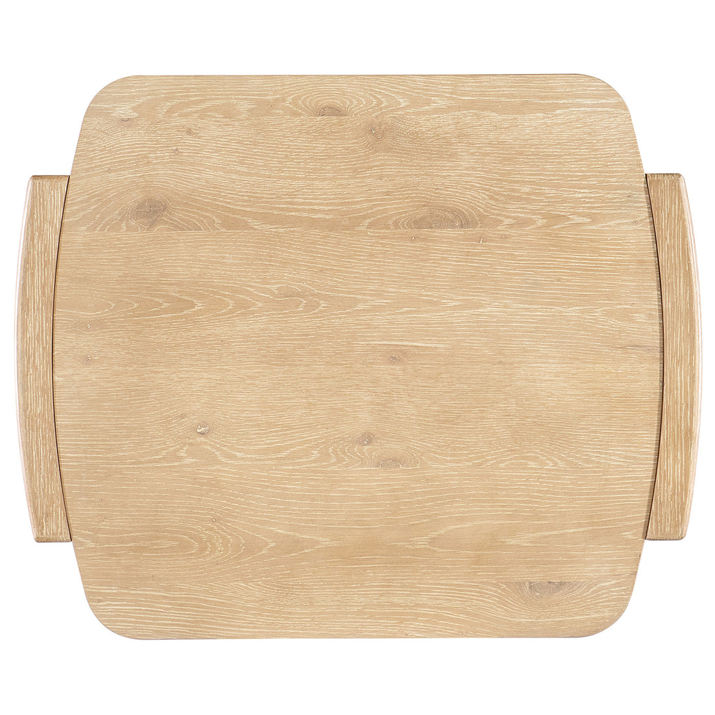 The Retreat End Table has a tranquil personality with a modern twist. Simple, clean lines are in a chunky square shape with rounded corners and interlocking block-style legs. Crafted of Oak Veneers, it is finished in the sand-colored Dune, transparent by design to reveal the unique grain patterns of the wood veneer. One lower fixed shelf.