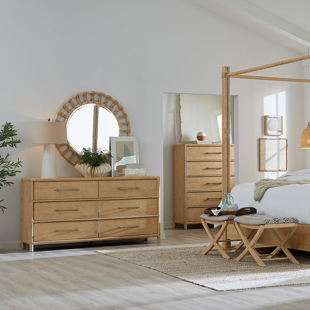 Inspired by tropical getaways, the Retreat Pole Rattan Five-Drawer Chest is a blend of natural materials in a laid-back, versatile design. Crafted of Oak and Maple Veneers with Rope accents, the chest offers five self-closing drawers, the top drawer has a removable felt liner and the bottom drawer is cedar-lined. The textured, pewter-colored bar pulls add a look of natural elegance.