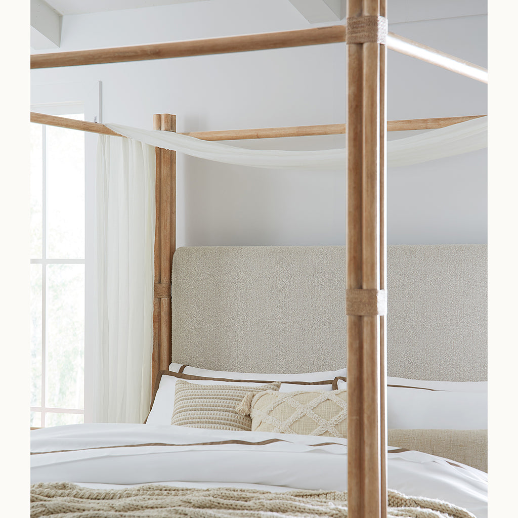 Create a personal oasis inspired by tropical getaways with the Retreat Pole Rattan Upholstered Bed with Canopy. The dramatic bundled pole-designed motif with rope accents creates a laid-back luxury, complemented by the side rails crafted of Oak Veneers and finished in the sand-colored Dune finish, transparent by design to reveal the unique character of the wood veneer. The Neo Cream fabric on the upholstered headboard adds inviting softness and comfort. Includes headboard, footboard and rails.