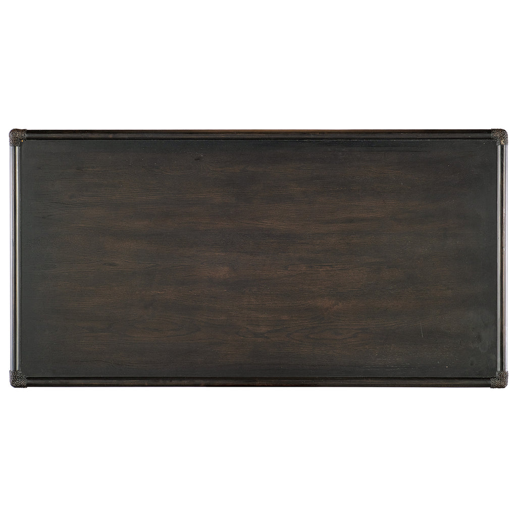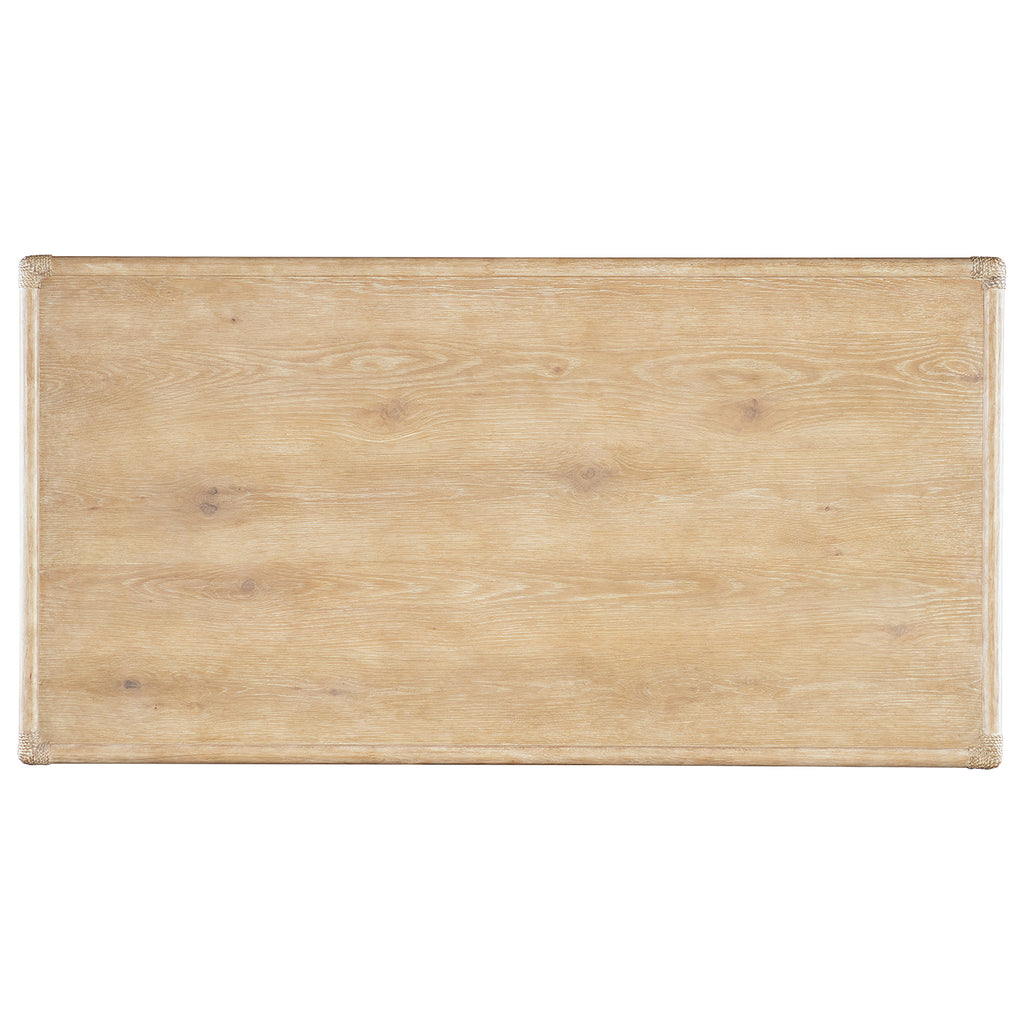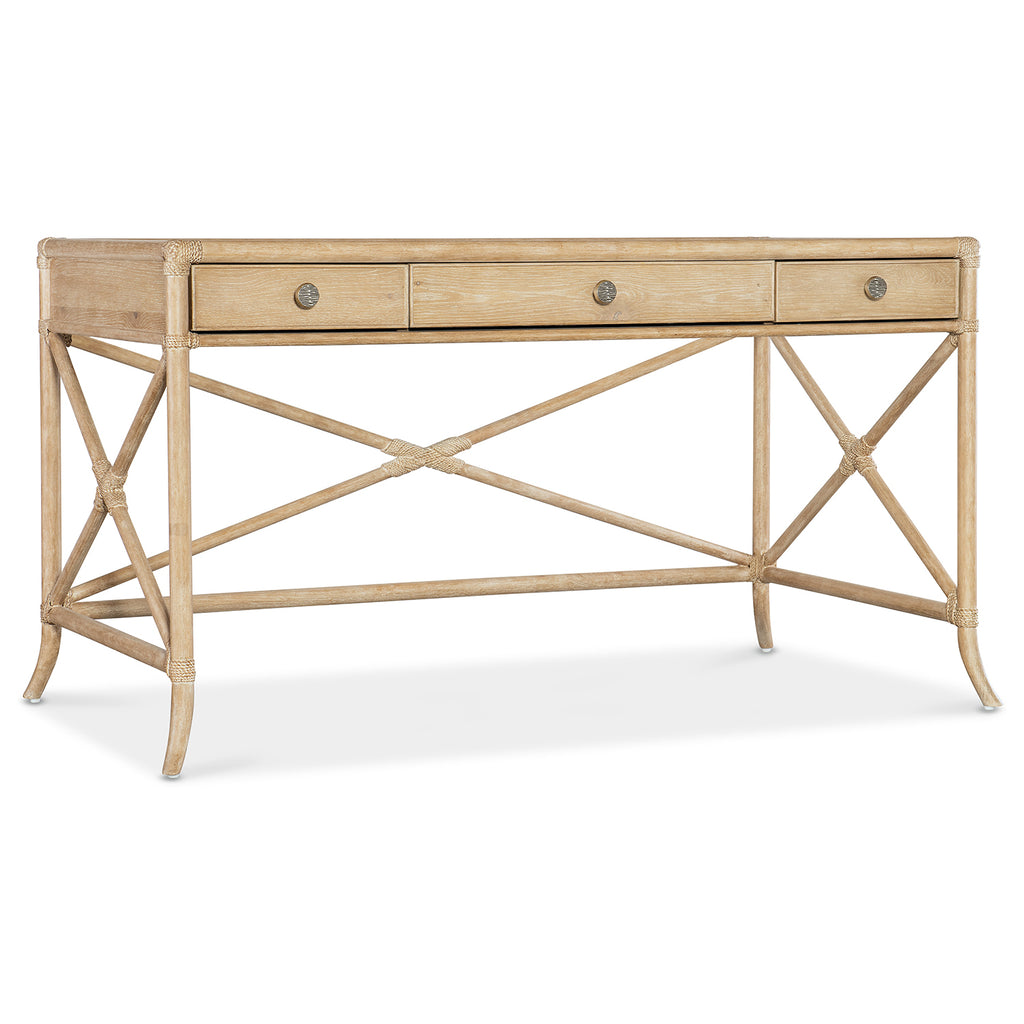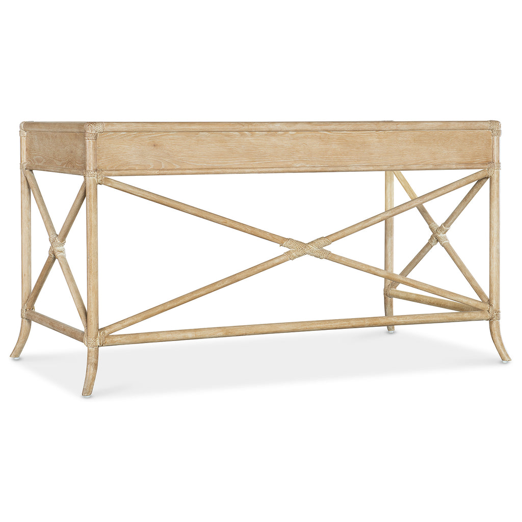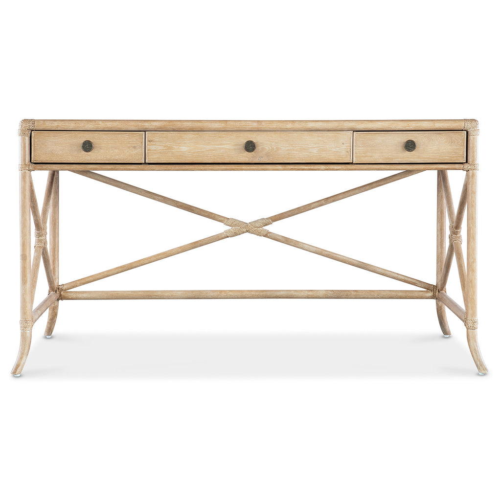 With the sublime vibe of an island oasis, the Retreat Writing Desk is crafted of Oak and Maple Veneers in a Bamboo motif and accented by rope. X-design stretchers on the back and sides distinguish the piece, transparent by design to showcase the unique patterns of the wood veneer. Featuring three drawers, the left and right drawers have two removable dividers. One pencil tray and one writing slide may be used on either side, and the center drawer has a drop-front for keyboard use. Finished on all sides.
