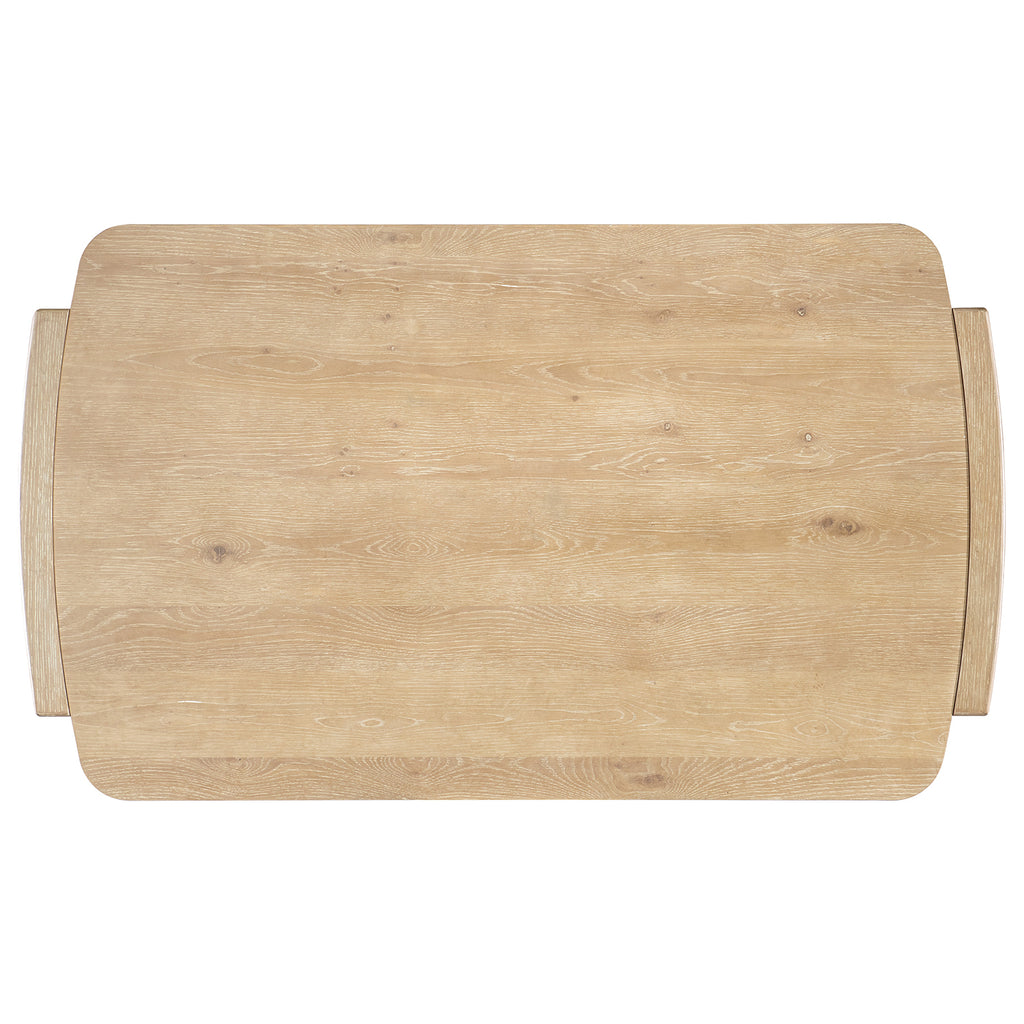 The Retreat Rectangle Cocktail Table has a tranquil personality with a modern twist. Simple, clean lines are in a rectangle shape with rounded corners and interlocking block-style legs. Crafted of Oak Veneers, it is finished in the sand-colored Dune, transparent by design to reveal the unique grain patterns of the wood veneer. One lower fixed shelf.