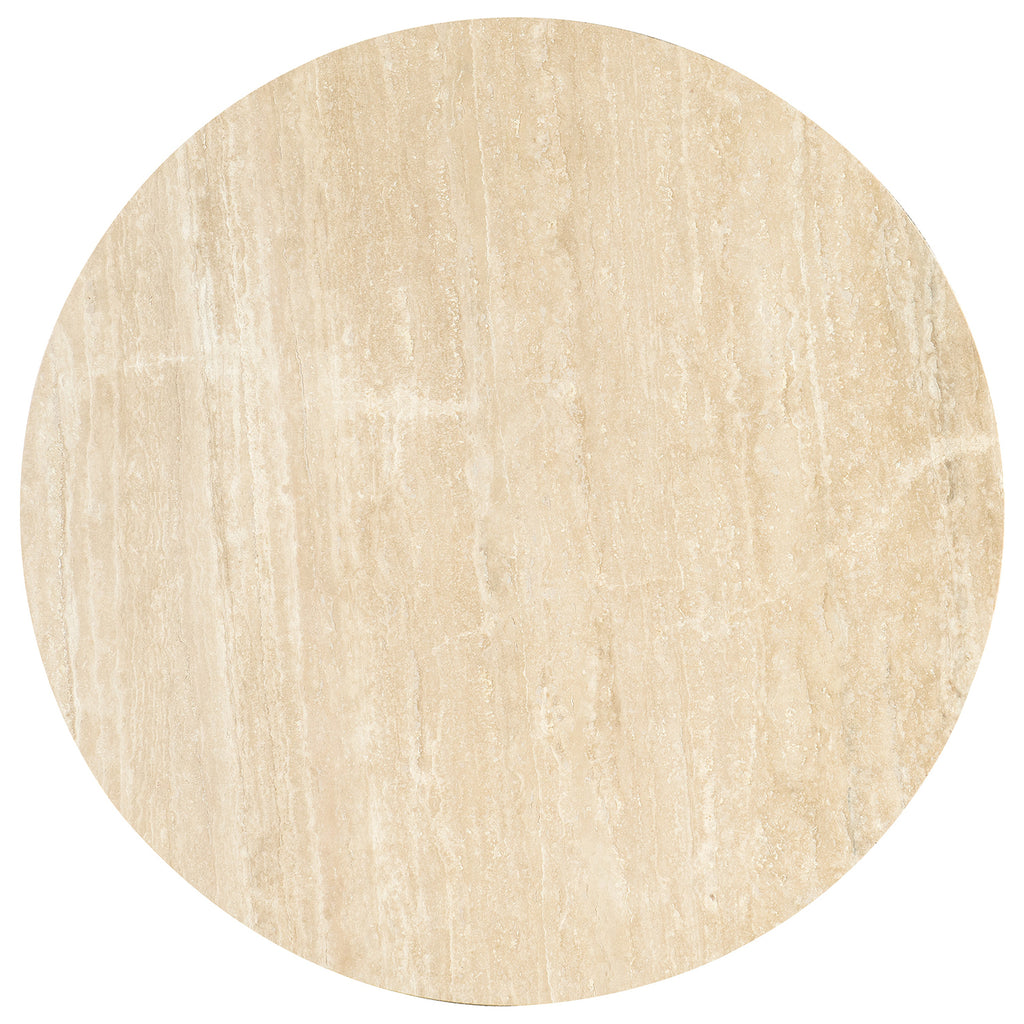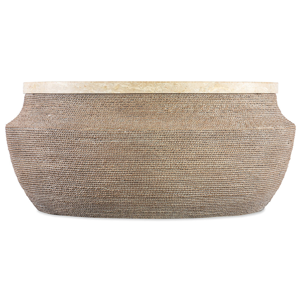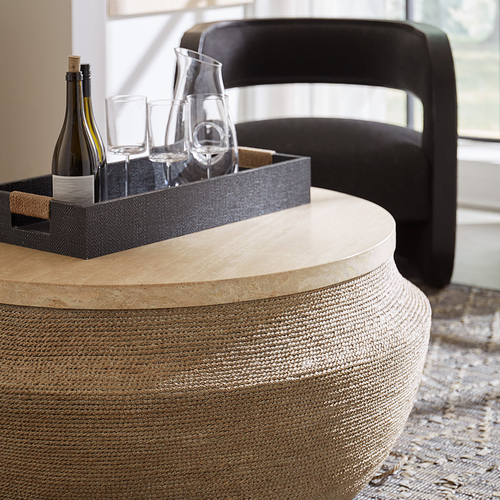 Earthy, organic and chic, the Retreat Round Cocktail Table is rope-wrapped with a Travertine Stone Veneer top. The Travertine Veneer features brown, beige, gray and cream colors, and the rope wrapping is brown. On casters for easy mobility.