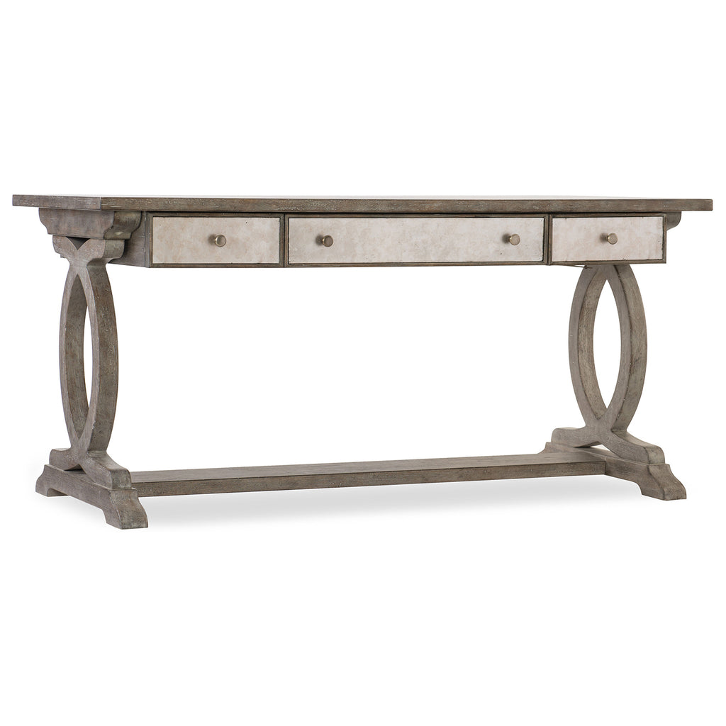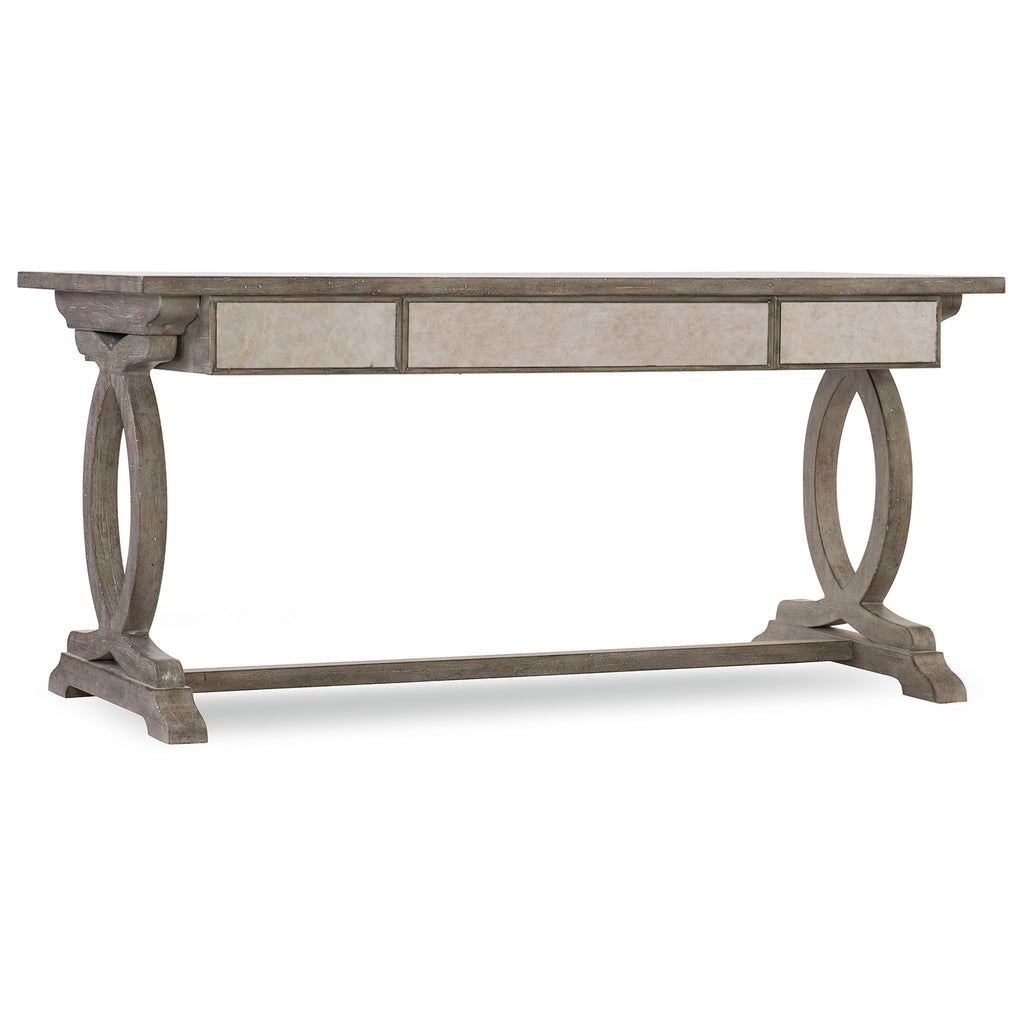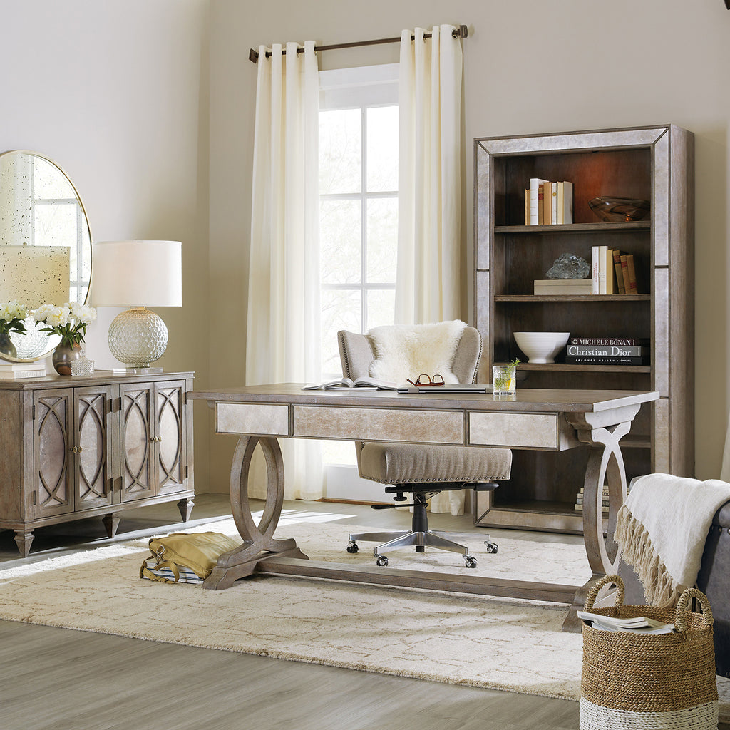 We’re sure this is the most glamorous work-from-home desk solution you’ll find anywhere. With trestle base with shaped circular end panels, the Rustic Glam Leg Trestle Desk is crafted of Quartered White Oak Veneers and glass with shimmery eglomise accents. The center drop-front drawer accommodates a keyboard, and there are two utility drawers with two dividers in each. One pencil tray and mouse pad can be used in either side drawer. Antique brass knob hardware.
